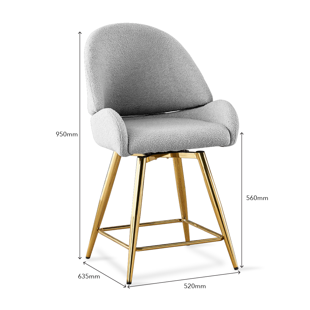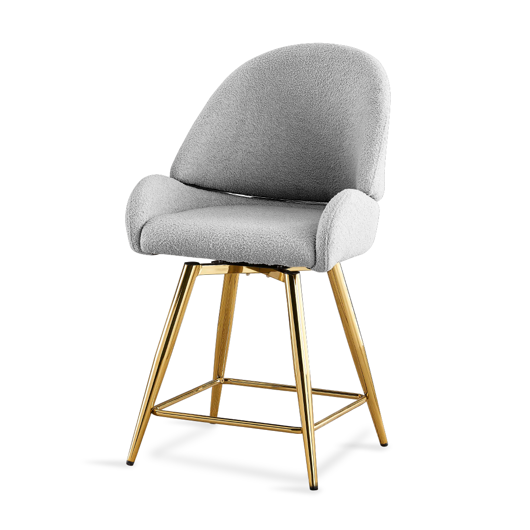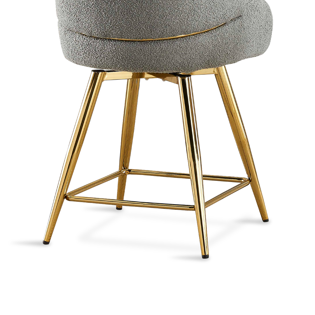 The Amit Island Chair is a sophisticated and luxurious piece of furniture, featuring a Grey Green Teddy Velvet upholstery, a sturdy plywood seat frame with plush foam cushioning, and elegant Chrome Gold legs. Its standout feature is the 180-degree swivel capability, which adds versatility and functionality to its elegant design, making it a stylish and comfortable addition to any living space.