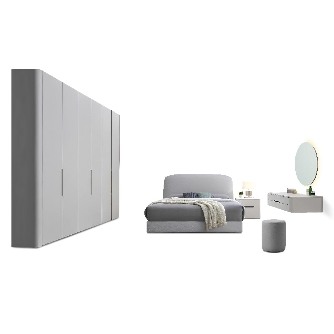 Venosa Bedroom Set – A modern and elegant collection designed for both style and function. Featuring a fabric-upholstered bedframe with easy-clean fabric, an 8ft wardrobe with sleek curve panel design, a floating dressing table with LED mirror and drawer, plus a matching bedside table. Crafted with durable Meranti wood, MDF, and high-density compression board for long-lasting quality.
