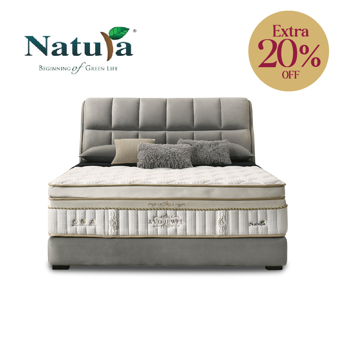 Rediscover restful sleep with the Natura Avo Jewel Mattress. Featuring a 7-Zone Pocketed Spring system for targeted support, Cool Gel Memory Foam for pressure relief, and Active Probiotics for allergen protection, it combines comfort, wellness, and eco-friendly materials like natural coconut fiber. Sleep better, naturally!