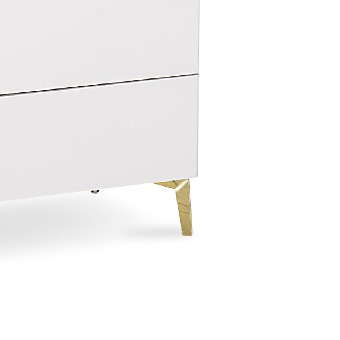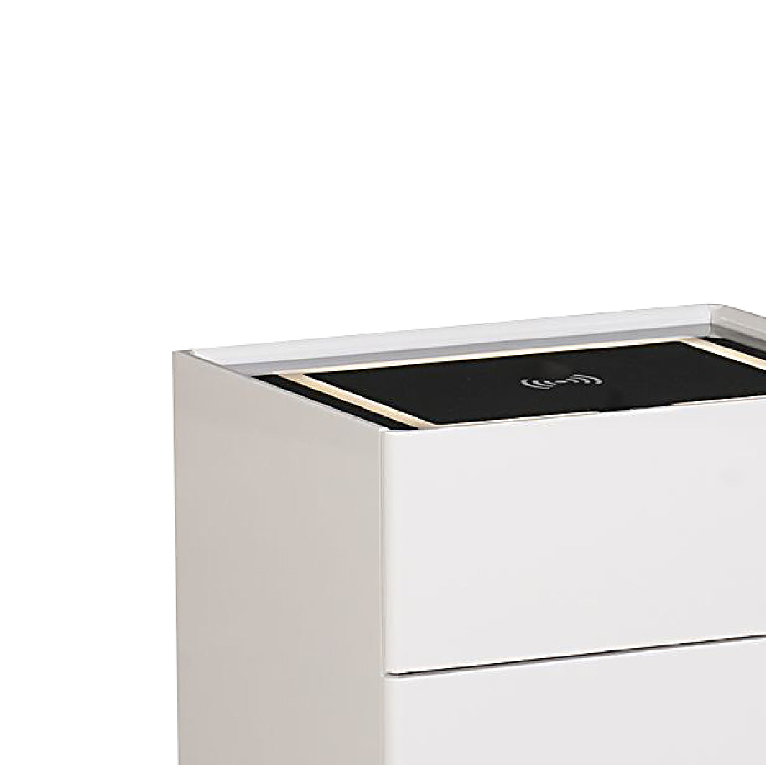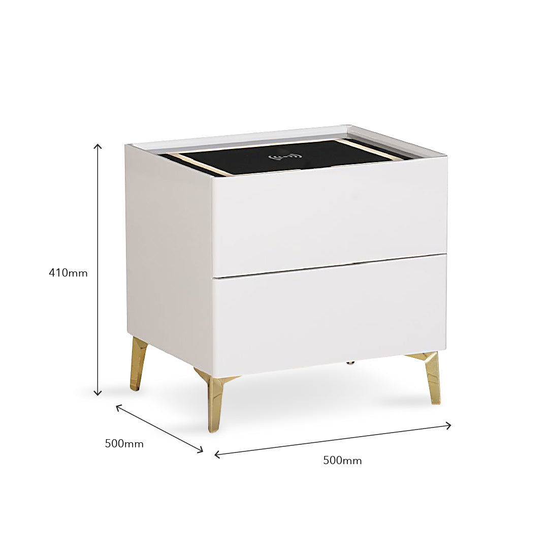 The Blythe Bedside Table combines modern style and convenience, featuring a high-gloss finish with sturdy metal legs. It offers wireless charging for easy device use, adjustable 3-color LED lighting for customizable ambiance, and two spacious drawers for organized storage, making it a sleek and functional addition to any bedroom.