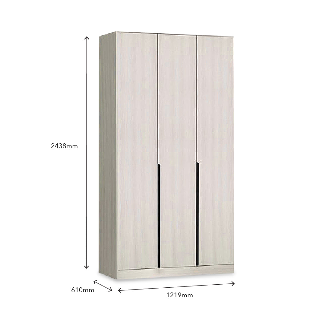 The Casen 3 Door Wardrobe is a stylish and durable storage solution made from high-density compression board with a melamine wood surface. It offers versatile storage with two doors that reveal a hanging rod for clothes, along with seven shelves and one drawer for organizing accessories and essentials, making it perfect for keeping your space tidy and organized.
