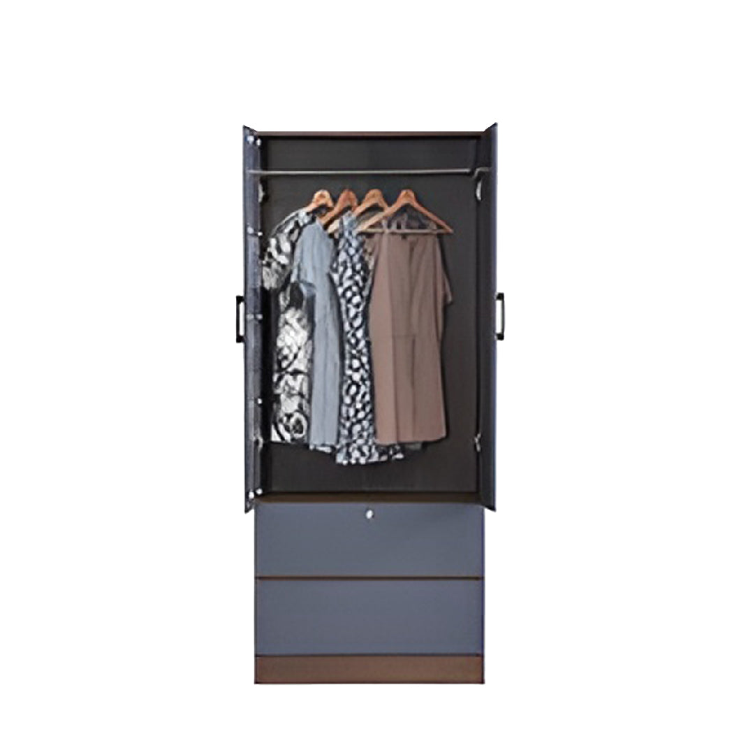 The Crawton 2 Door Wardrobe offers smart storage with a sleek shark grey laminated finish. It features 2 drawers, 2 hanging rods, and 3 shelves, with an option for additional top storage. Stylish and functional, it's perfect for modern spaces.