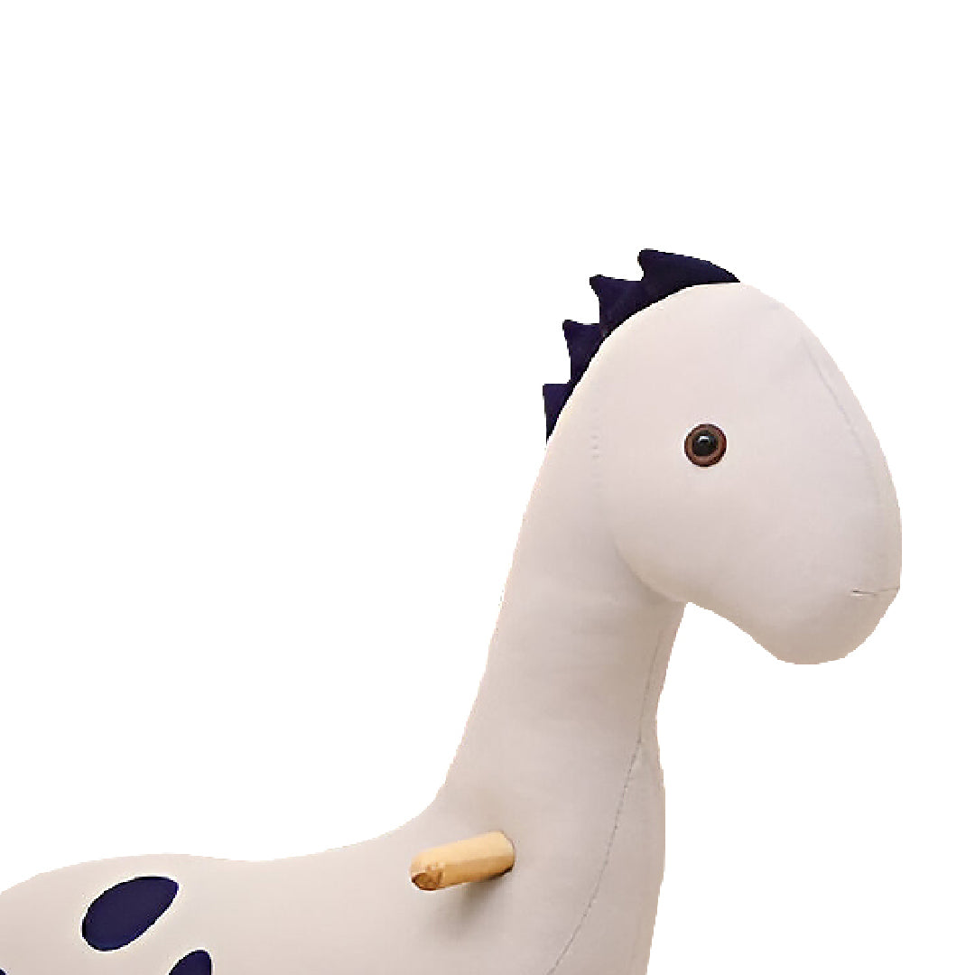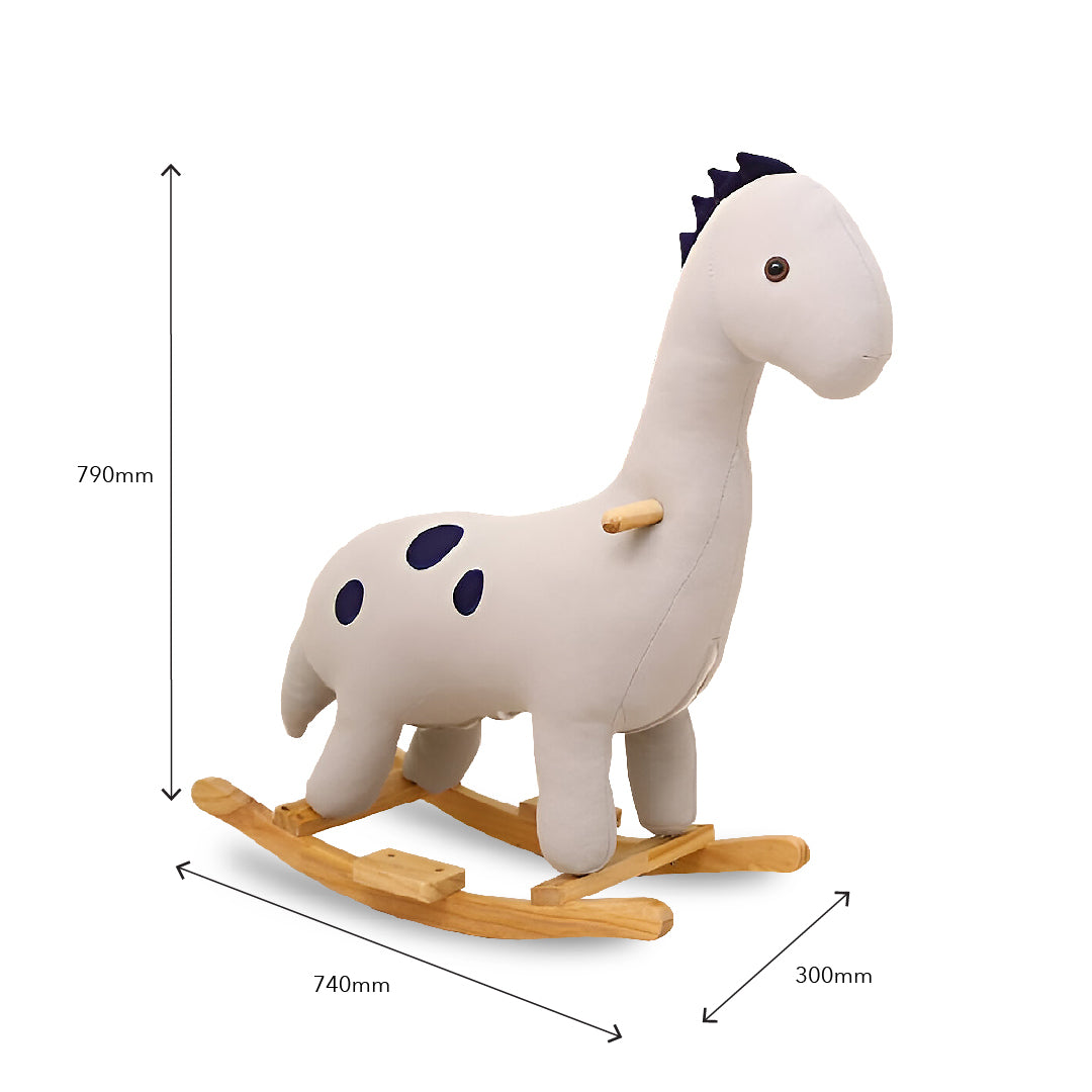 The kids' rocking dinosaur is a delightful and durable toy, designed with solid wood legs for stability and covered in soft cotton fabric for comfort. Filled with foam, it provides a cushioned ride. Available in light grey, soft pink, and dusty purple, this charming piece not only offers endless fun but also adds a whimsical touch to any child's room decor.