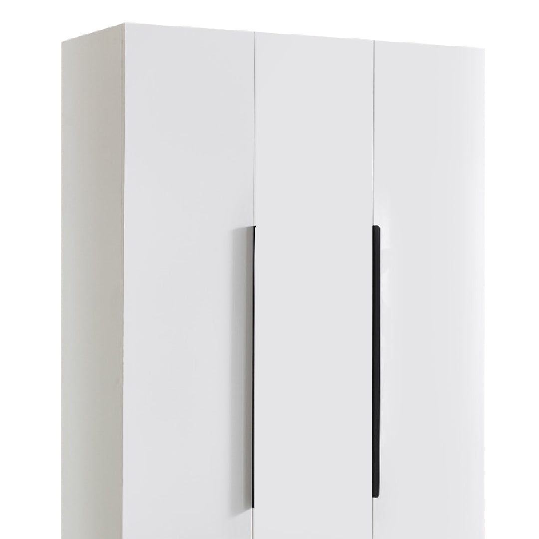 Crafted from durable MDF with a sleek high-gloss hot press finish and sturdy powder-coated handles, this wardrobe offers ample storage space with a modern, polished look.