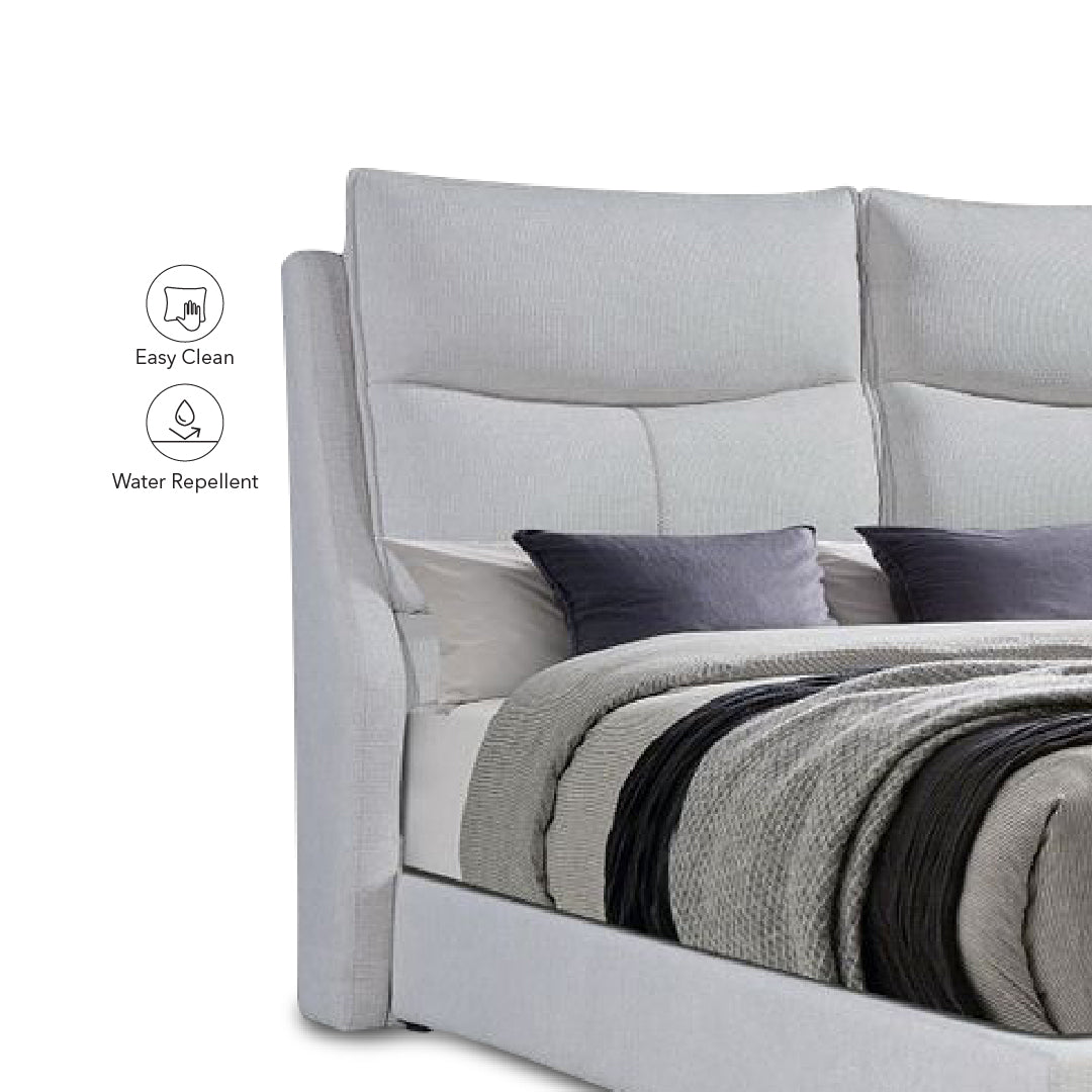 Sleek and durable, the Vasto Bed is built with a solid Meranti wood frame and stylish chrome metal legs. Upholstered in easy-clean, water-repellent fabric, it offers a perfect blend of contemporary design and everyday functionality.