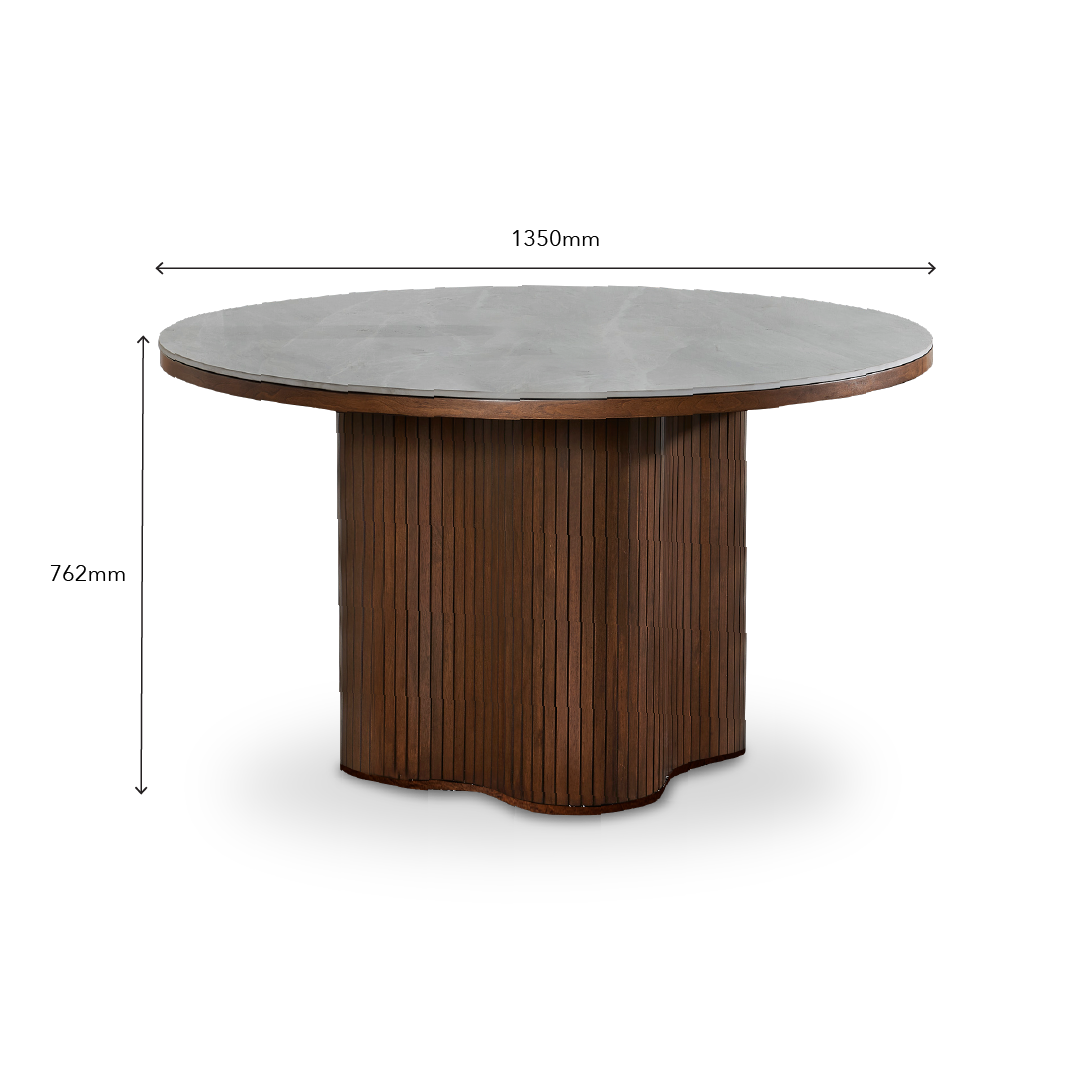 The Kiona Ceramic Round Dining Table is an elegant and durable piece with a glossy grey sintered stone top and solid rubberwood legs adorned with veneer. This high-quality table combines sophistication with natural warmth, making it a stylish and resilient centerpiece for any dining space.
