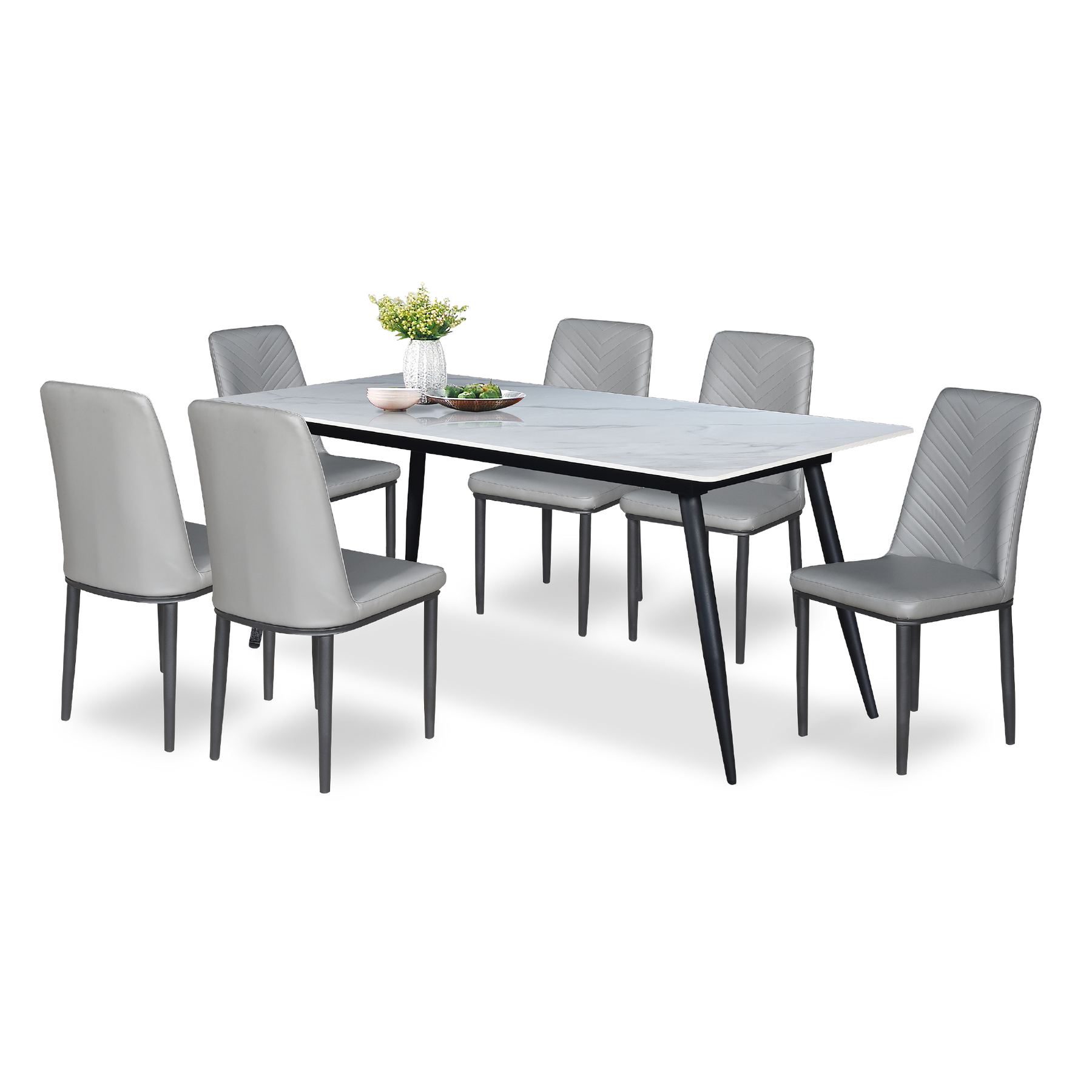 Elevate your dining experience, creating cherished memories in a blend of indulgence and style with the FIANNO II White Ceramic Dining Set. Enhance your dining area by envisioning gatherings around the elegant white ceramic table, its smooth surface offering both style and durability. Accompanied by six dining chairs, featuring soft PU leather upholstery and sturdy powder-coated steel legs, this set combines comfort and elegance. The FIANNO II Dining Set graces your space and becomes a canvas for celebrating togetherness in a warm and inviting manner.