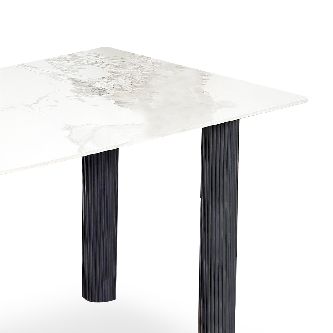 The Wulan Dining Set features a sleek oval dining table with a white marble-look sintered stone top and black metal legs, paired with four stylish dark grey chairs. Each chair combines a fabric seat, rattan backrest, and metal frame for a modern yet natural look. Also available with dark grey chairs.