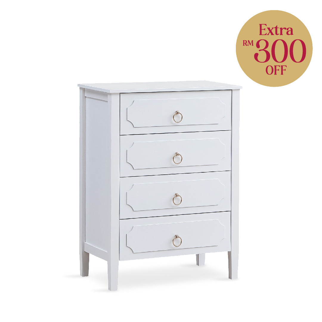The Mariana Chest of Drawers combines elegance and functionality with its natural white finish and durable construction. Crafted from high-quality rubberwood and medium-density fibreboard (MDF), it offers a sleek, modern look while providing ample storage for your essentials. Perfect for any room, its neutral design effortlessly complements various decor styles.