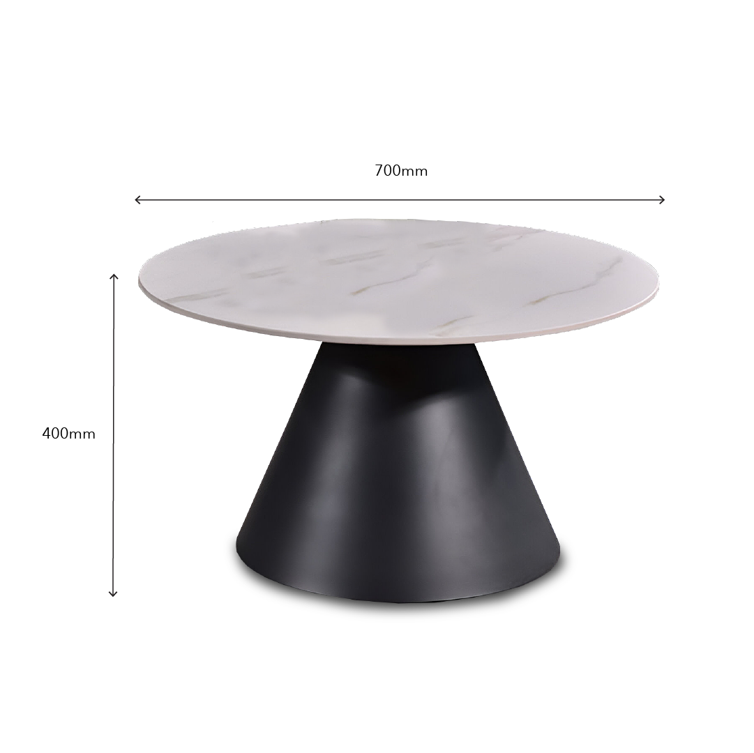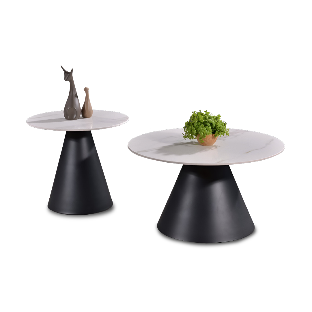The Agarica Coffee Table Set features a round shape and includes a Coffee Table and Side Table. The tables are made with a ceramic top for a modern look and easy maintenance, while the legs are powder-coated for durability and style. This set offers both functionality and elegance, making it a great addition to any living space.