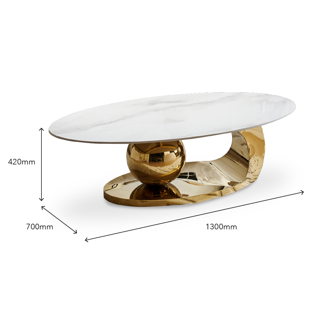 The Carmela II Coffee Table is a sophisticated and uniquely designed piece, featuring an oval shape that adds a touch of elegance to any living space. Its top is crafted from high-quality sintered stone, providing both a refined aesthetic and durability. Supported by sleek gold stainless steel legs, this coffee table strikes a perfect balance between opulence and stability. The combination of its distinctive oval shape and premium materials makes the Carmela Coffee Table a captivating addition that seamlessly blends modern elegance with functionality.