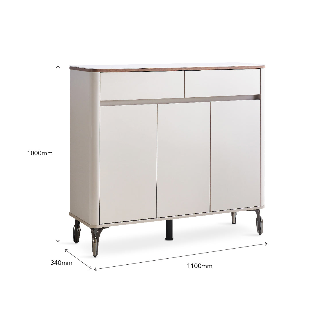 A stylish storage solution featuring a ceramic marble top, PVC vacuum body, and sturdy metal legs. Designed with 3 open doors and 2 drawers, it blends modern elegance with practical organization for your footwear and essentials.
