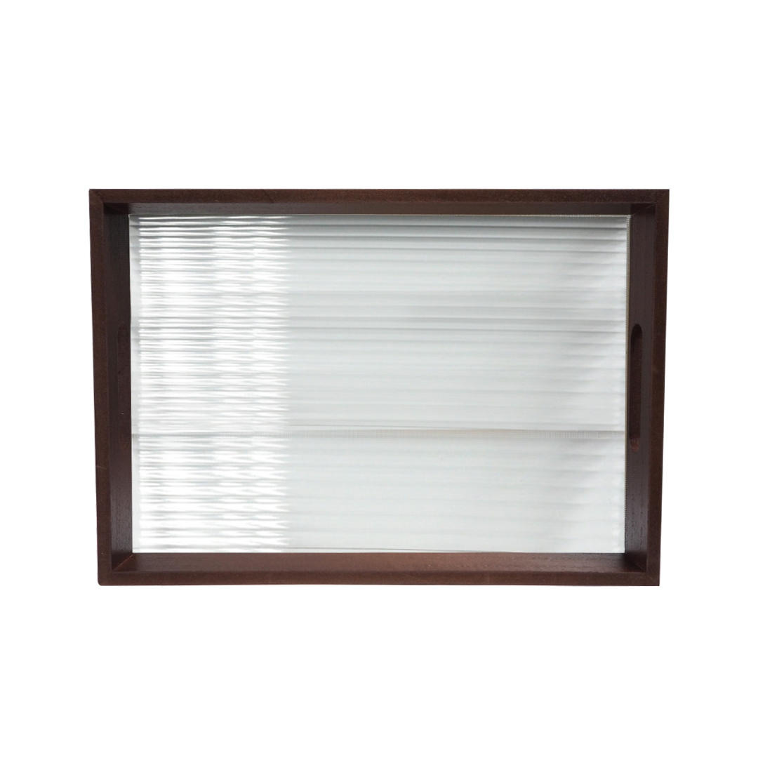 This rectangular wooden tray features a stylish design with a wooden frame in rich brown and a base made of stripes thickened glass, offering durability and elegance. Available in two sizes, large and small, it serves various purposes from serving to organizing, making it a versatile addition to any home decor, blending rustic charm with contemporary aesthetics seamlessly.