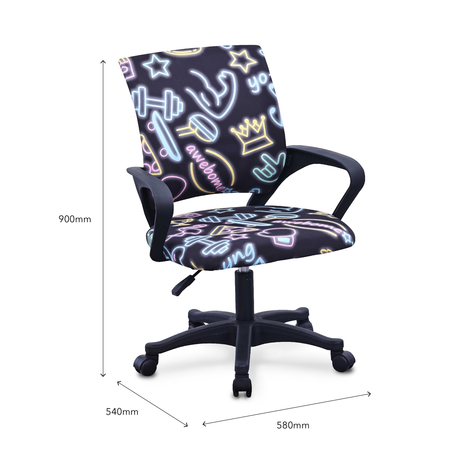 This Neonflo Low Back Office Chair is a vibrant, functional chair featuring a black fabric with a bold neon graphic print. It is constructed with a Polypropylene (PP) base, fixed armrests, and an adjustable height feature powered by a Standard Gaslift, making it a stylish and practical choice for modern workspaces.