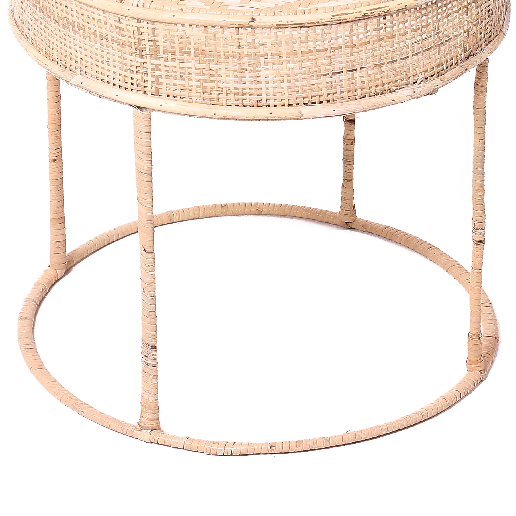 The Magari Side Table is a striking and versatile piece of furniture that seamlessly blends various materials to create a visually captivating and functional round side table. Designed with precision and an appreciation for aesthetics, this table features a harmonious combination of materials, including powder-coated metal, plywood, bamboo webbing, square webbing, skin lasio, teak wood, and natural rattan.