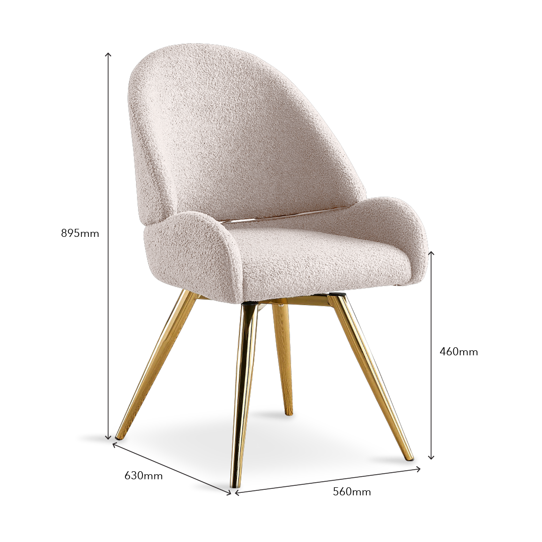 The Amias Dining Chair is a sophisticated and versatile addition to your dining room, featuring a Beige Grey Teddy Velvet upholstery that exudes understated luxury. Its robust plywood seat frame, generously padded with high-quality foam, ensures both durability and comfort. The Chrome Gold accents on the legs add a touch of glamour and refinement to the chair's design. Notably, the chair boasts a 180-degree swivel feature, enhancing dining experiences by providing easy access around the table and facilitating smooth conversations. This combination of style and functionality makes the Amias Dining Chair a practical and elegant choice for elevating your dining space.