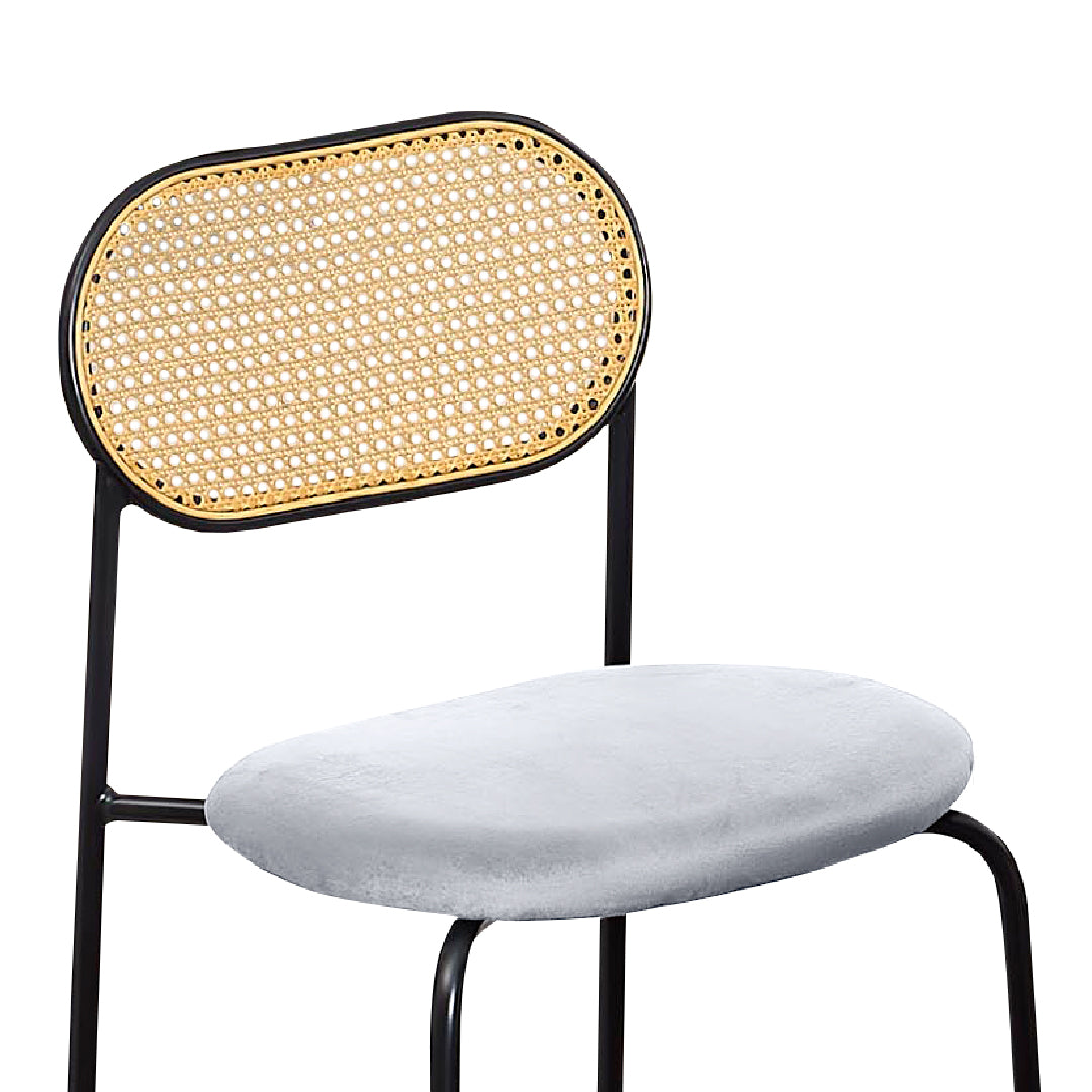 Blending natural texture with modern design, the Divine Dining Chair features a dark grey fabric seat, rattan backrest, and sturdy metal frame. Stylish and comfortable, it’s also available in dark grey.