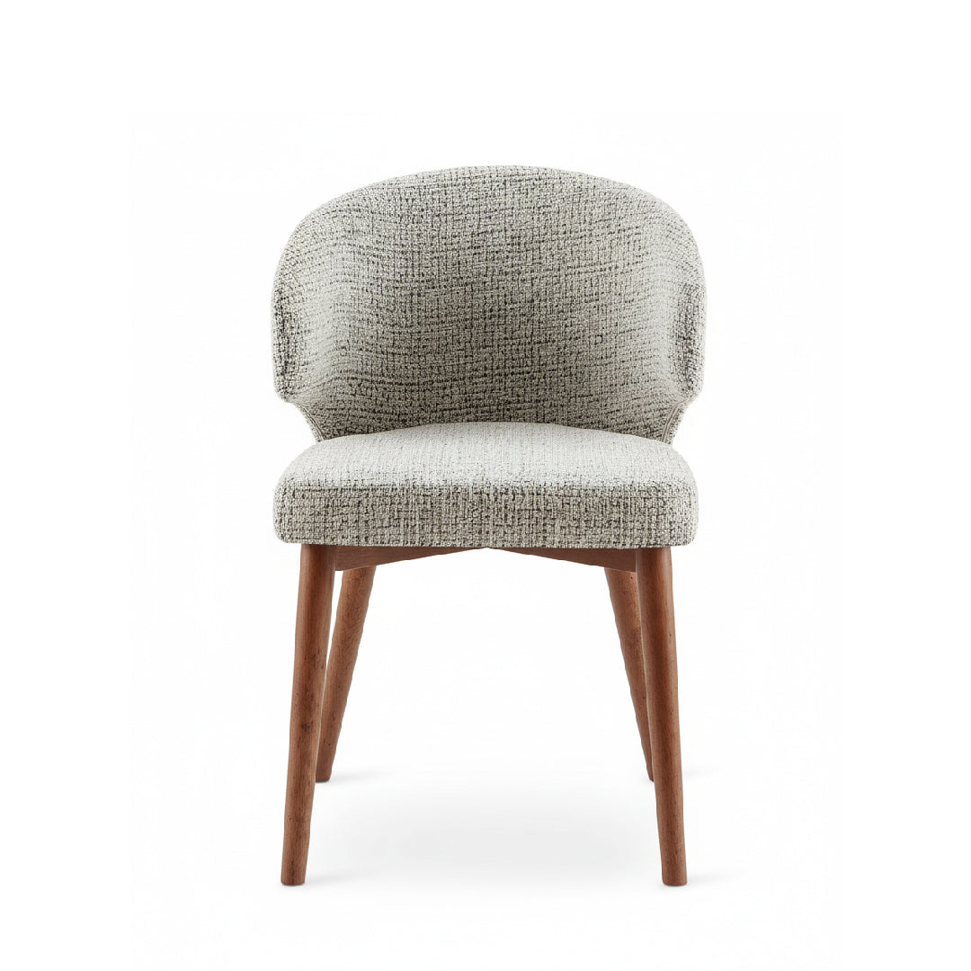 A comfortable dining chair crafted with soft fabric upholstery and sturdy solid rubberwood, featuring easy-clean material for effortless maintenance.
