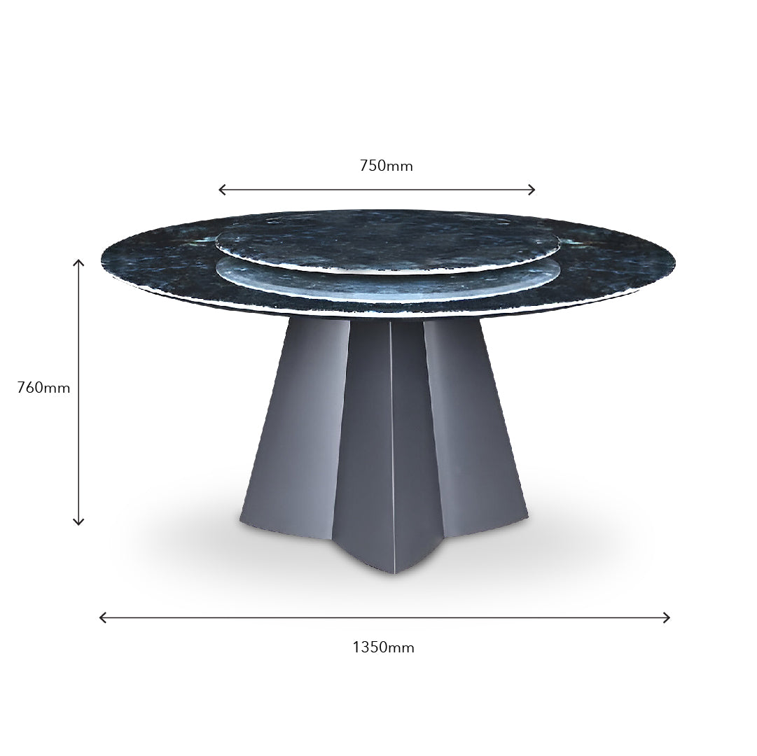 The Cirrus Marble Dining Table features a sleek Crystal Marble top and uniquely shaped Fluorocarbon Coating legs, blending elegance with modern design. Complete with a Lazy Susan for easy serving, it comes in two sizes, 1.35 meters and 1.5 meters, making it a stylish and functional addition to any dining space.
