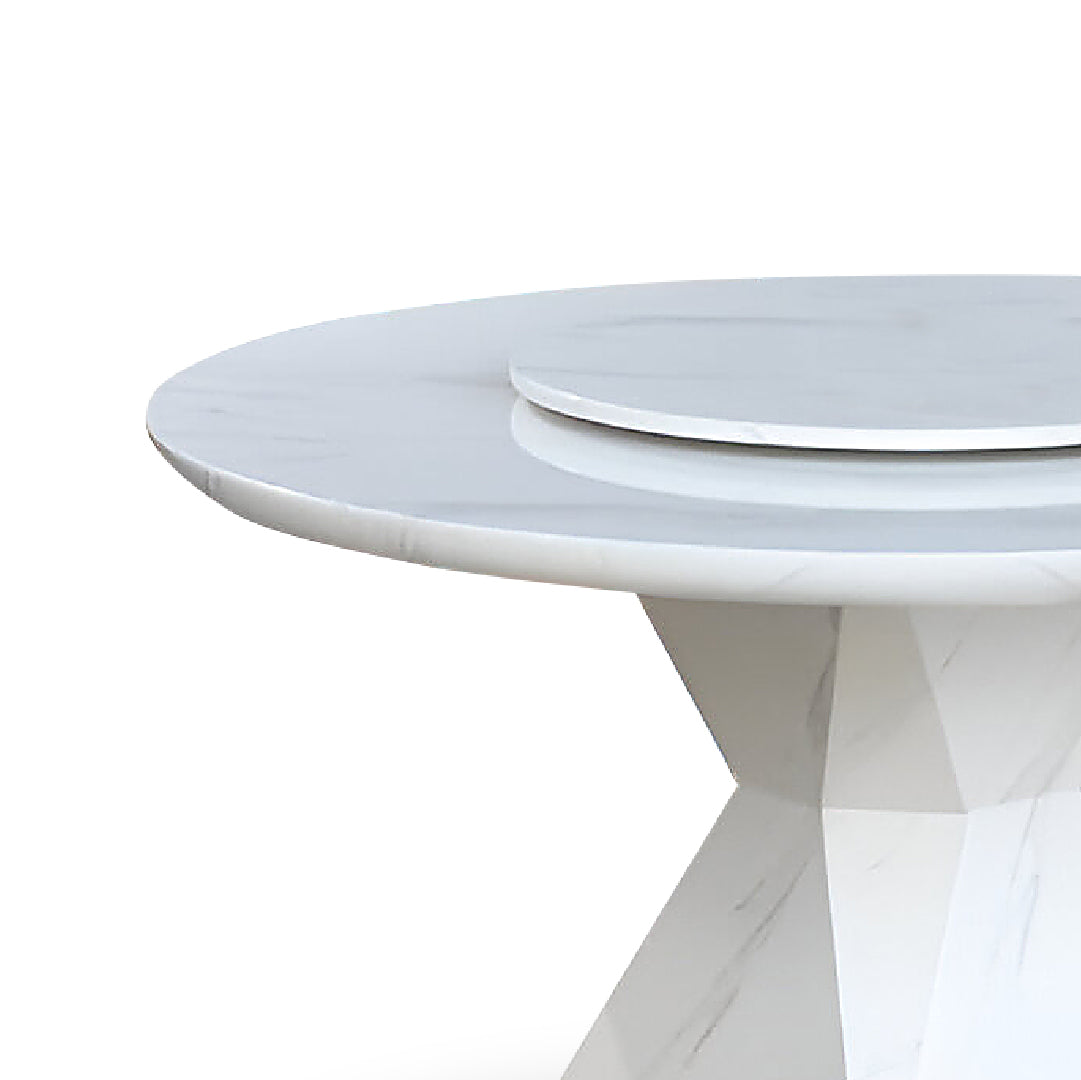The Khalisa Marble Dining Table is a stylish round table featuring a durable Laminated Marble top and a sturdy marble base, complete with a convenient Lazy Susan for easy serving. Available in 1.35 meters and 1.5 meters, it combines elegance with practicality, making it a perfect choice for both intimate dining and social gatherings.