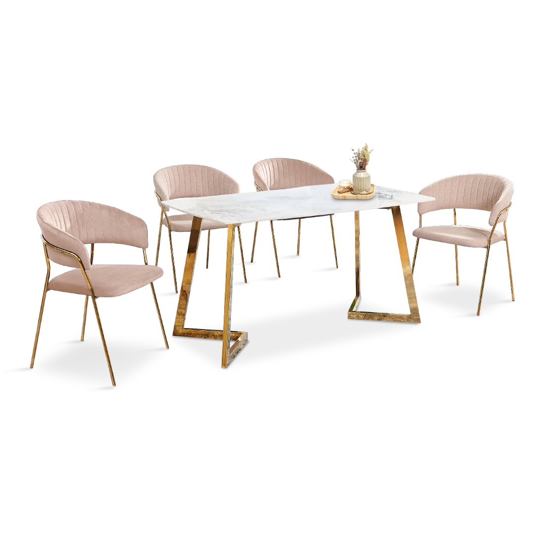Displaying the ESME Sintered Stone Dining Set, a tasteful fusion of robustness and elegance. This gorgeous set includes four chairs with luxurious Velvet Fabric in Beige or Dark Grey, and a table with a sturdy Sintered Stone top and Chrome Gold legs. This elegant set will elevate your dining experience because it combines flair and substance.