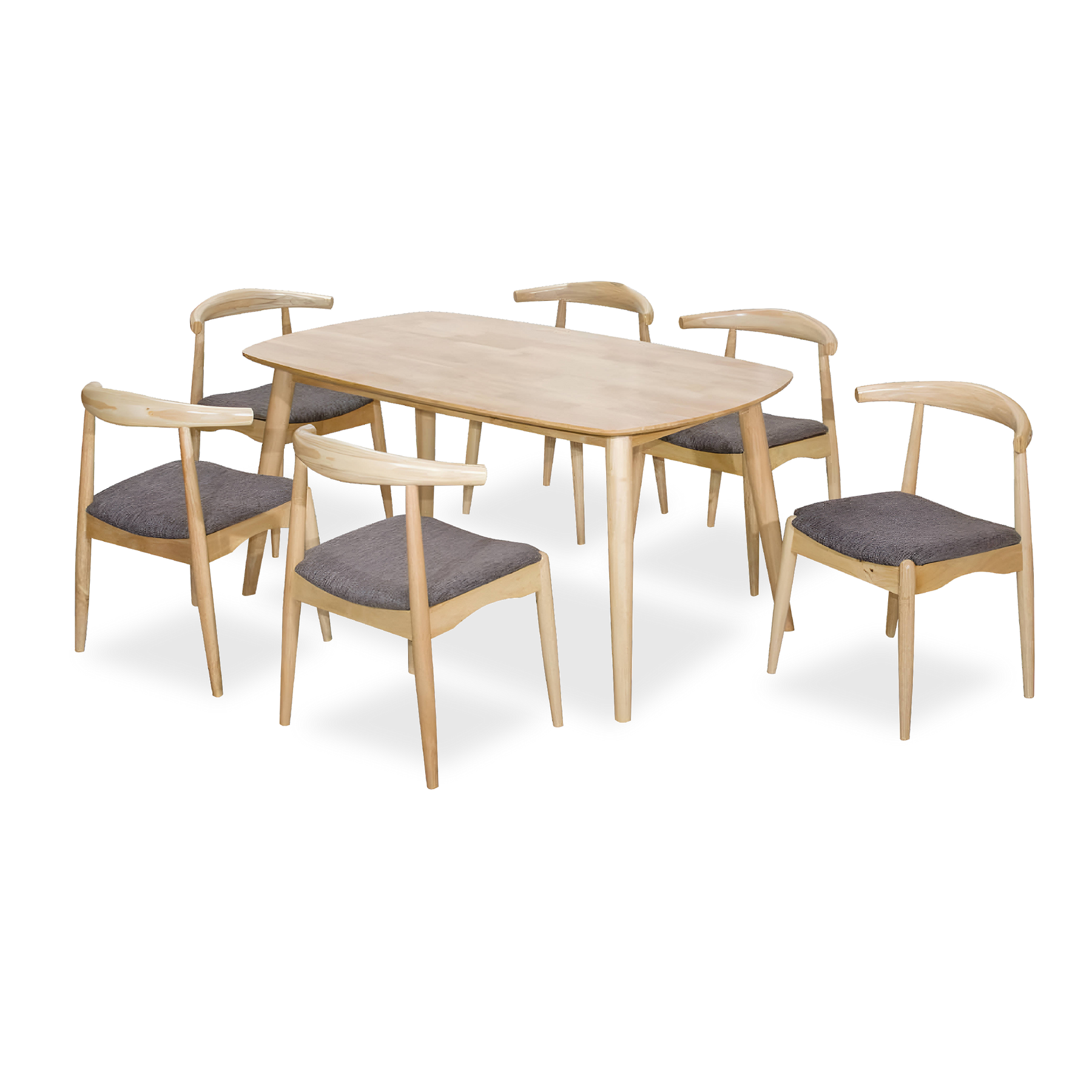 Introducing our elegant dining table set of 1 table +6 chairs, consisting of a solid rubberwood table in natural brown and matching chairs with polyester fabric seats. The set features a generous table size and comfortable seating with foam cushions. Enhance your dining area with style and sophistication.