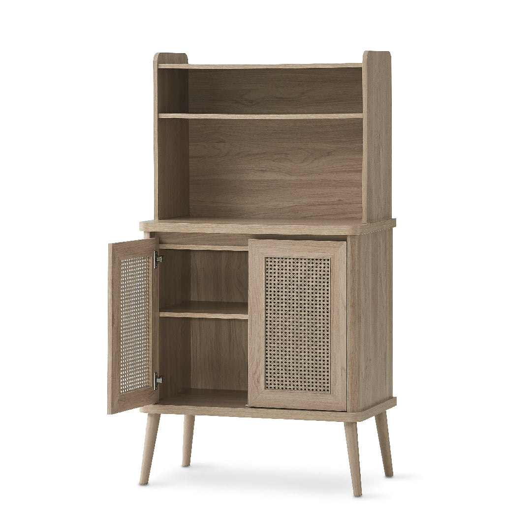 The Hawea Multipurpose Cabinet features a durable Particle Board construction with a Melamine Base and stylish Woven Rattan panels. It includes 1 shelf and 2-door open storage, offering versatile and practical storage solutions with a modern, natural touch.