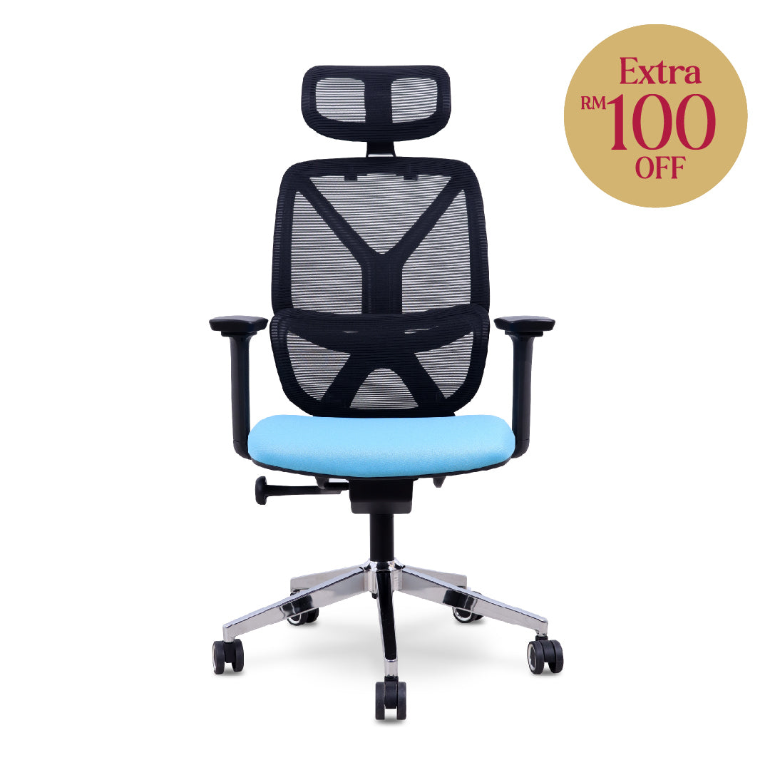 Aero I High Back Office Chair offers ergonomic comfort and modern functionality. Featuring a breathable mesh back, fabric seat, and 3D adjustable armrests, it provides support for long working hours. Equipped with a high-quality gaslift, heavy-duty chrome castors, and an imported autotension synchronized mechanism with 1-position locking, it ensures smooth adjustments and personalized seating.