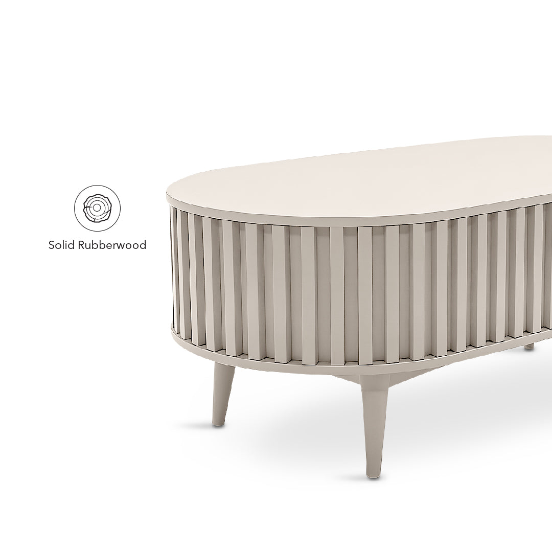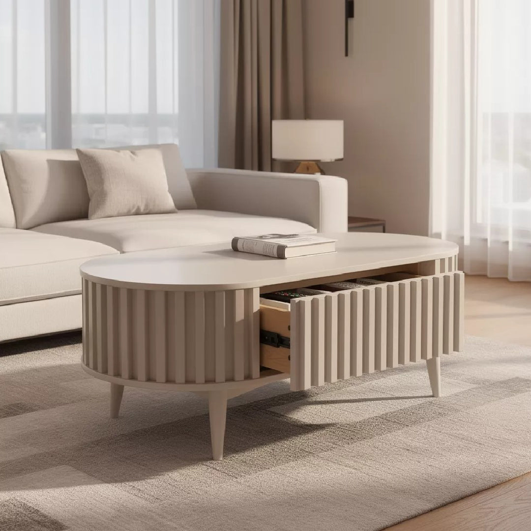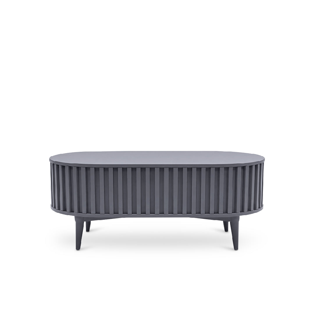 The Meije Coffee Table features a sleek dark gray finish with an elegant fluted design that adds texture and modern charm to any living space. Crafted with durable MDF for the top and bottom, and supported by solid rubberwood legs, it offers both stability and style. A practical built-in drawer provides convenient storage while maintaining a clean, minimalist look.