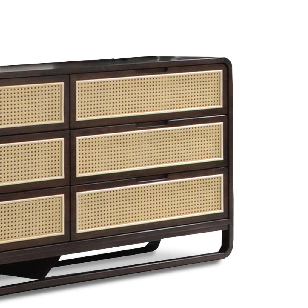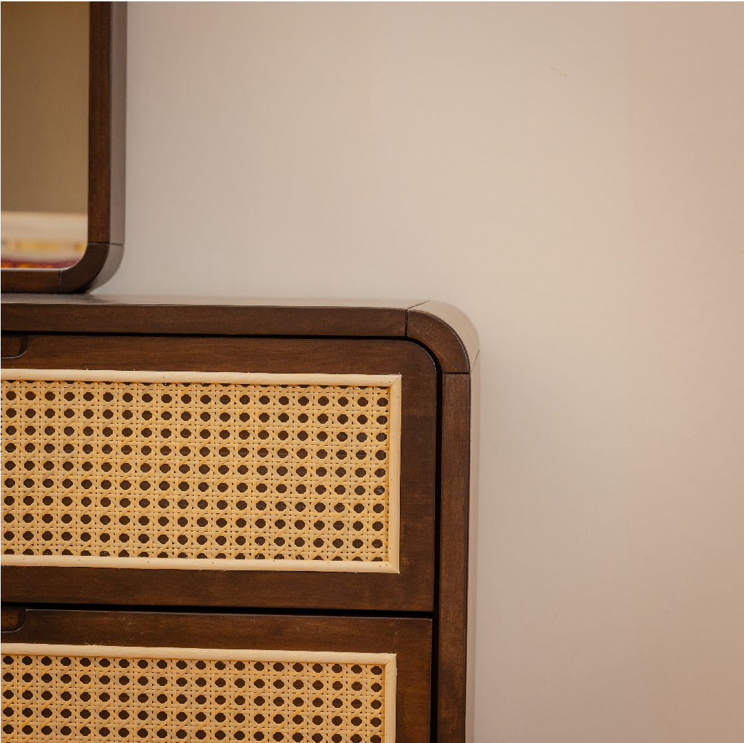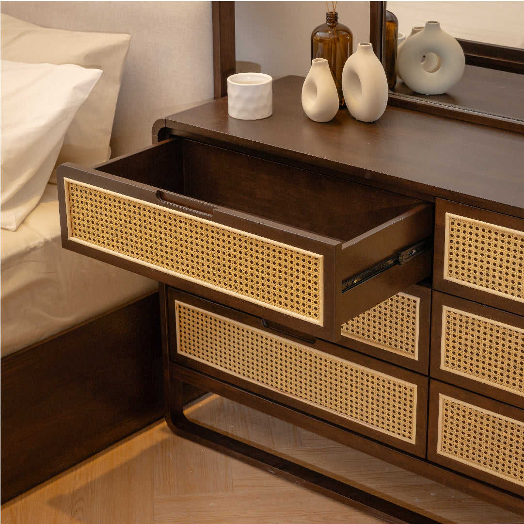 A chic fusion of contemporary style and organic elegance is provided by the KARA Dressing Table. It is constructed from sturdy rubber wood, ash veneer, and premium rattan, and has a rich chocolate finish that goes well with any type of decor. Its roomy surface and several storage choices make it a useful yet elegant addition to your dressing room or bedroom.