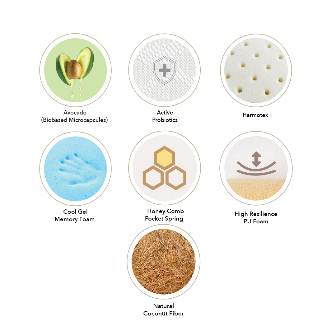 Rediscover restful sleep with the Natura Avo Jewel Mattress. Featuring a 7-Zone Pocketed Spring system for targeted support, Cool Gel Memory Foam for pressure relief, and Active Probiotics for allergen protection, it combines comfort, wellness, and eco-friendly materials like natural coconut fiber. Sleep better, naturally!