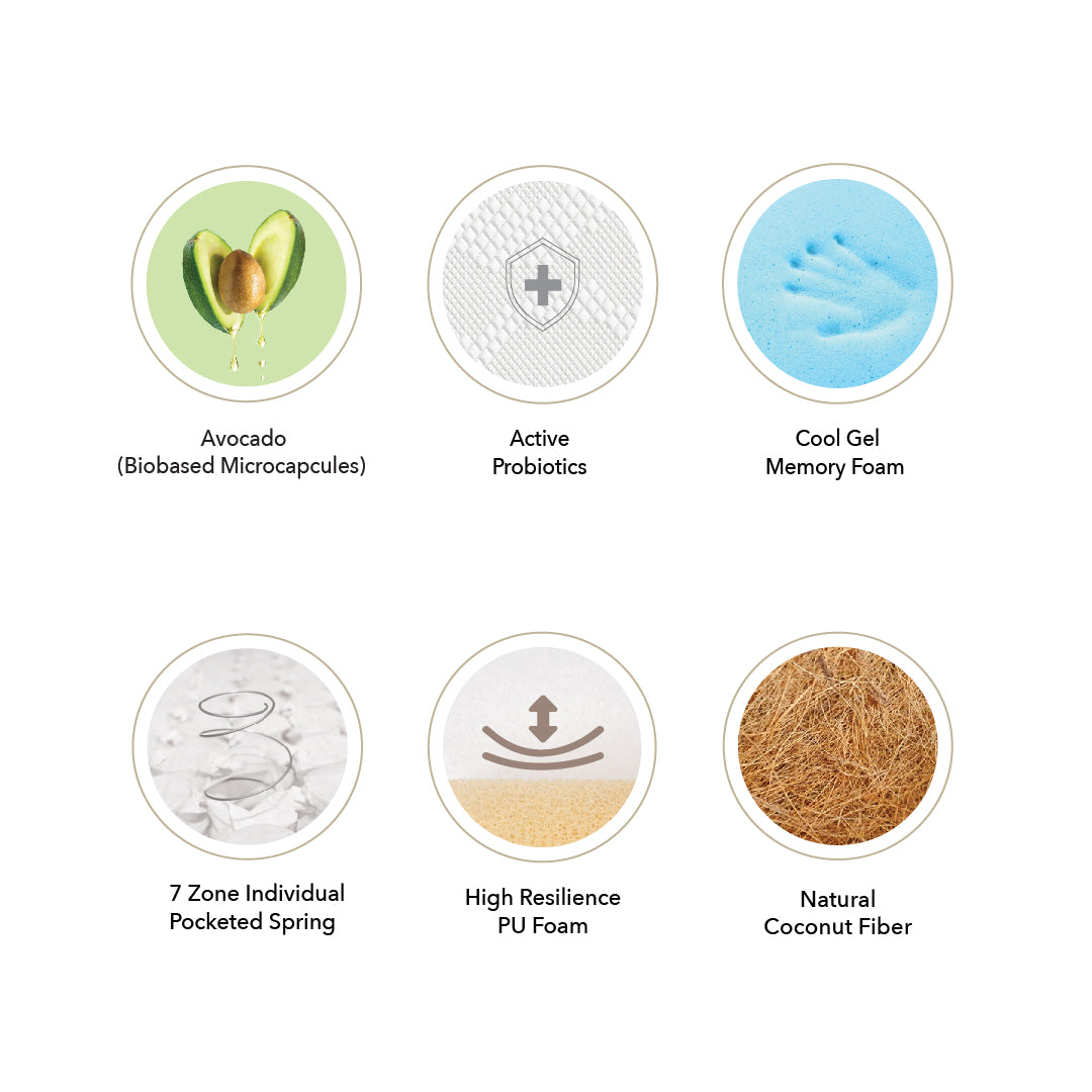 Rediscover restful sleep with the Natura Avo Plush Mattress. Featuring a 7-Zone Pocketed Spring system for targeted support, Cool Gel Memory Foam for pressure relief, and Active Probiotics for allergen protection, it combines comfort, wellness, and eco-friendly materials like natural coconut fiber. Sleep better, naturally!