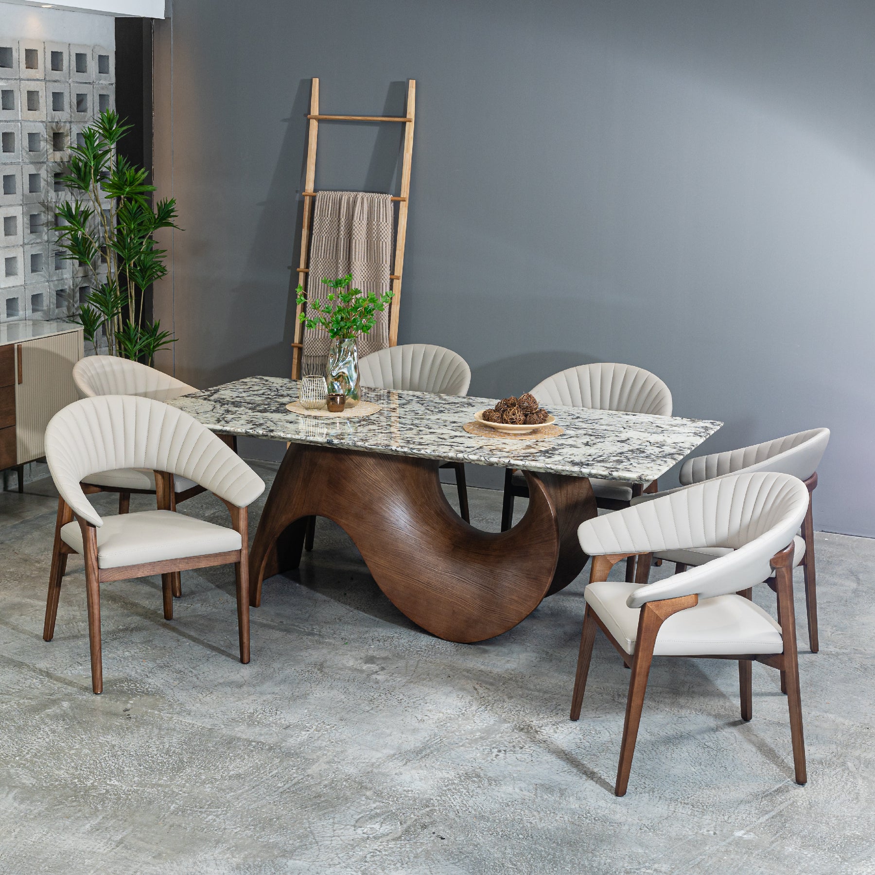 The Snow Fox Natural Marble dining table showcases Brazilian natural marble paired with ash wood, featuring a uniquely designed leg that adds a striking, contemporary touch to its elegant and timeless appeal.