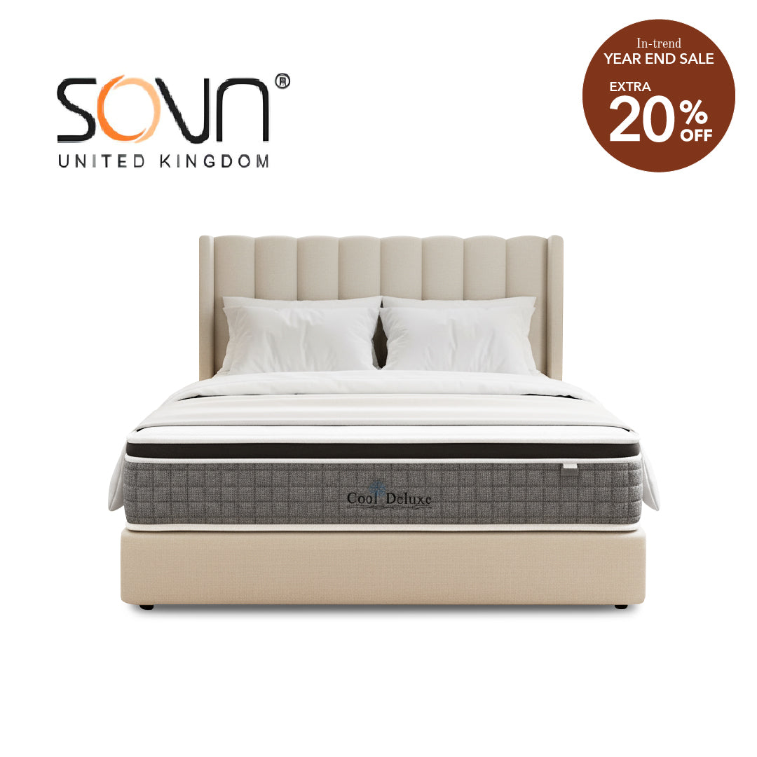 The SOVN Cool Deluxe Mattress combines advanced features for a comfortable and supportive sleep. It uses Cool Feel Fabric to regulate temperature, Gero Stress technology for enhanced relaxation, and an AntiStatic feature to reduce static buildup. The mattress also includes natural latex for responsive support and durability, while the 5 Zone Pocketed Spring system provides targeted support to align the spine and relieve pressure points. These elements work together to create a cool, comfortable, and restful sleep environment.