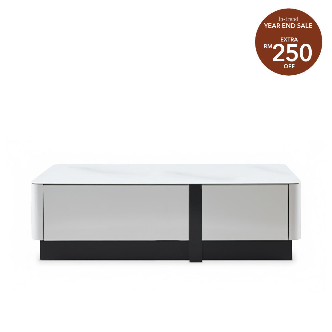 A stylish centerpiece with a sleek ceramic top, glossy high-gloss body, and sturdy spray MDF legs. Featuring 2 built-in drawers, it offers both modern elegance and practical storage for your living space.