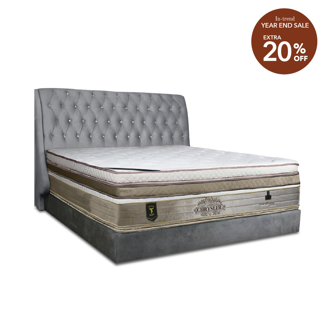 Take advantage of the LADY AMERICANA CHRYSLER Mattress to experience ultimate comfort. It envelops you with a Leggett and Platt 7 Zone hourglass spring variable rate and geometry pocket spring, together with Ice Silk, natural latex, and Valco Memory Foam. Its Ice SILK Knitted Fabric keeps you cool for a long time. Approved by chiropractors, it reduces partner disturbance and provides a masterful fusion of luxury and divine sleep with every second of relaxation.