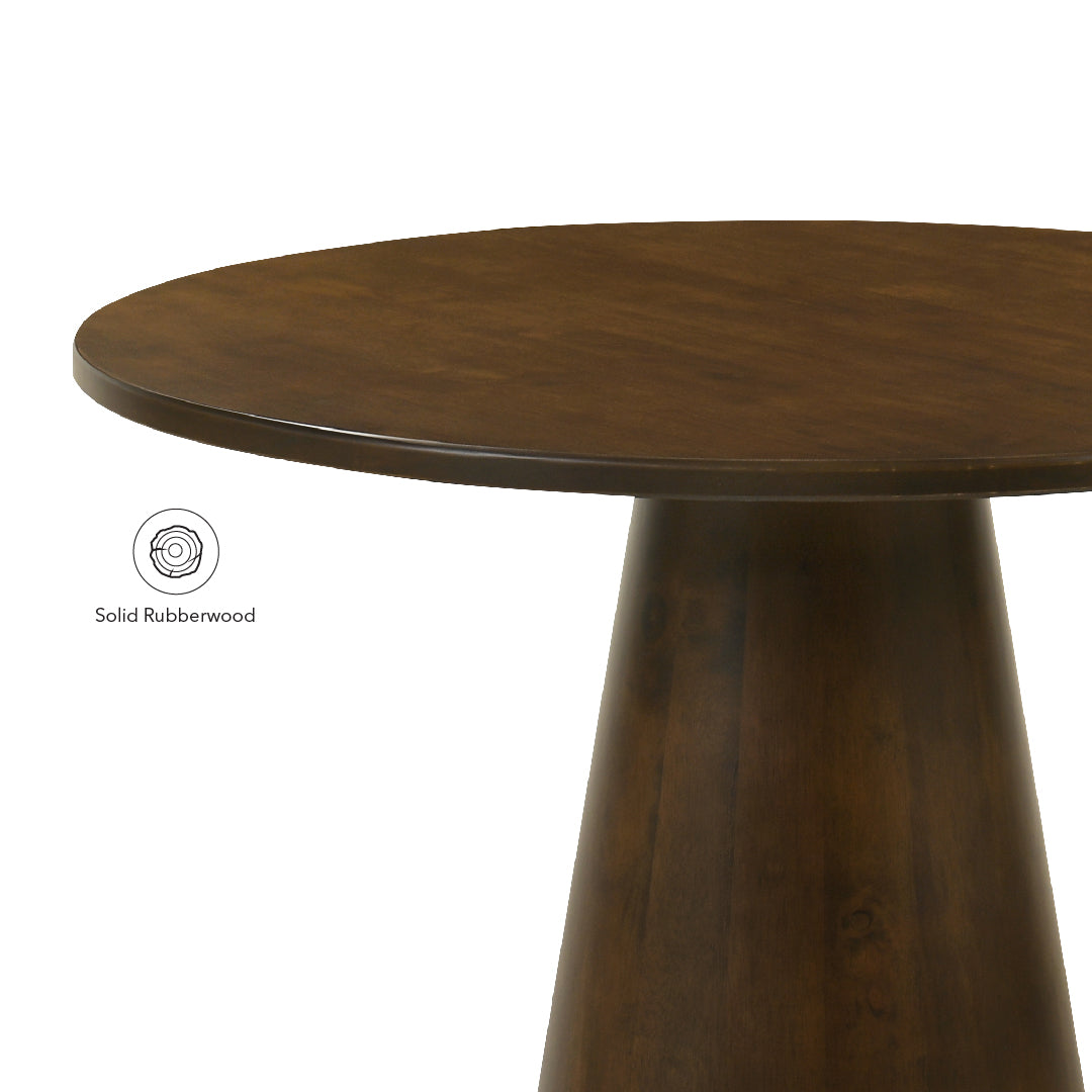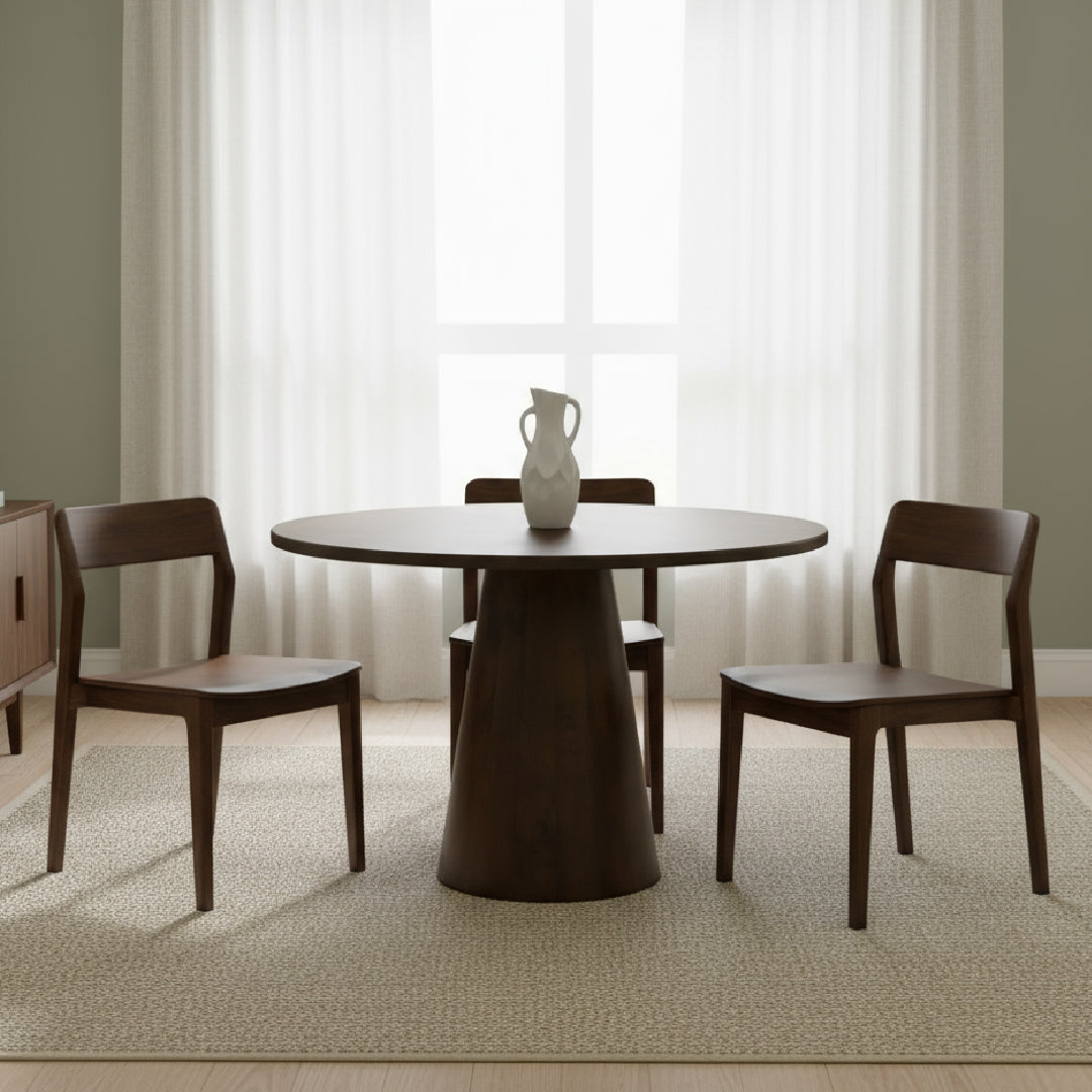 The Zuki Walnut Round Dining Table features a sleek, minimalist design crafted from solid rubberwood in a natural beech finish—perfect for creating a warm and inviting dining atmosphere.