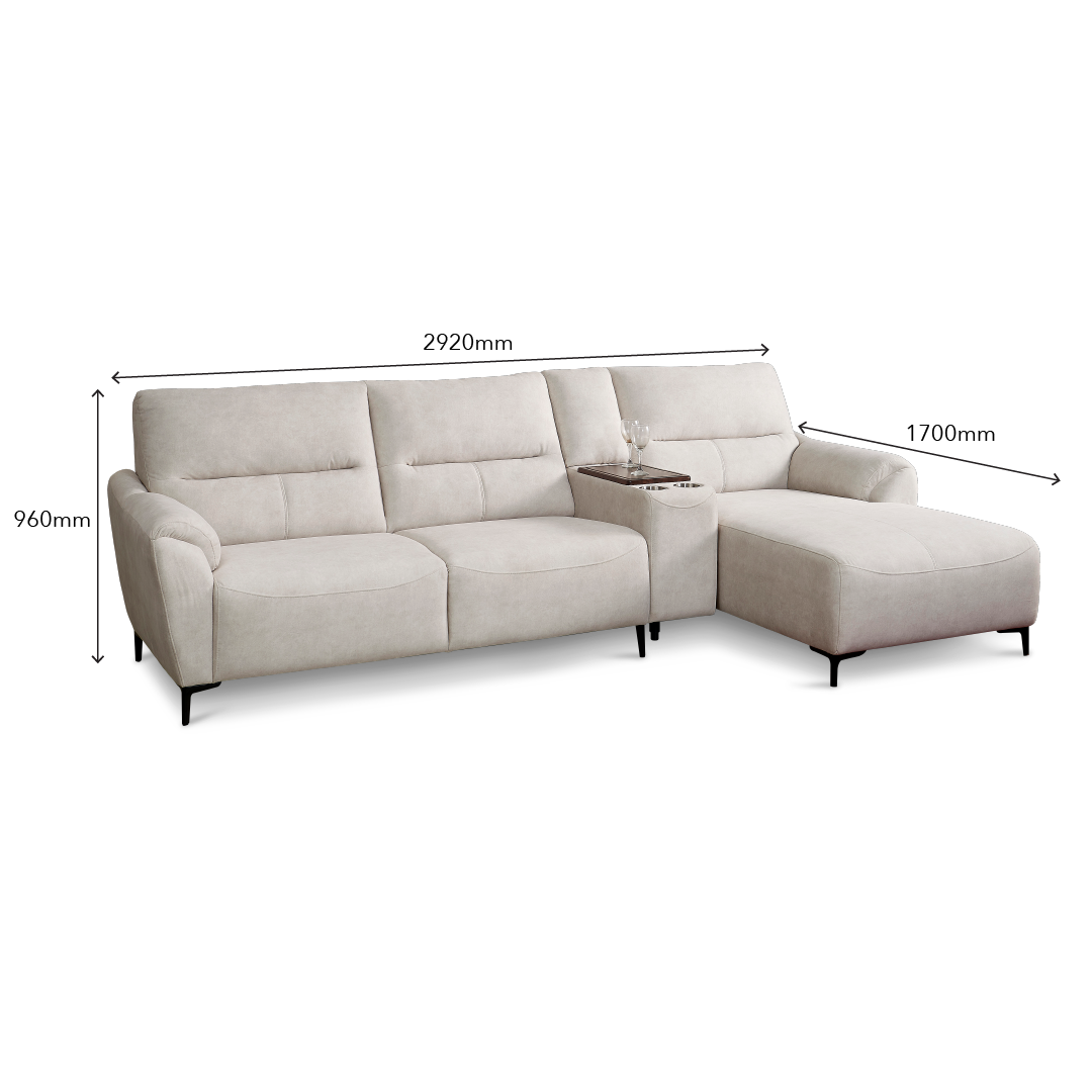 The Theon 3 Seater L-Shape Sofa is a well-constructed and stylish furniture piece, featuring a sturdy Meranti Wood frame, comfortable High Density Foam padding with Zigzag and Pocket Springs, and water-repellent, anti-scratch fabric upholstery. Its Powder Coated Metal legs provide stability and a modern aesthetic. Notably, the sofa includes two cup holders for convenience and a soft-close storage box for discreet and accessible item storage. This sofa combines durability, comfort, and practicality, making it an excellent addition to any living space.
