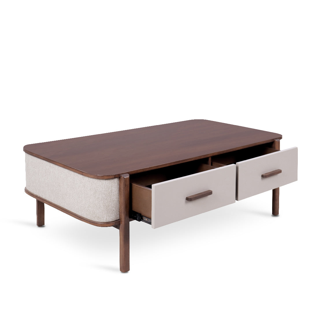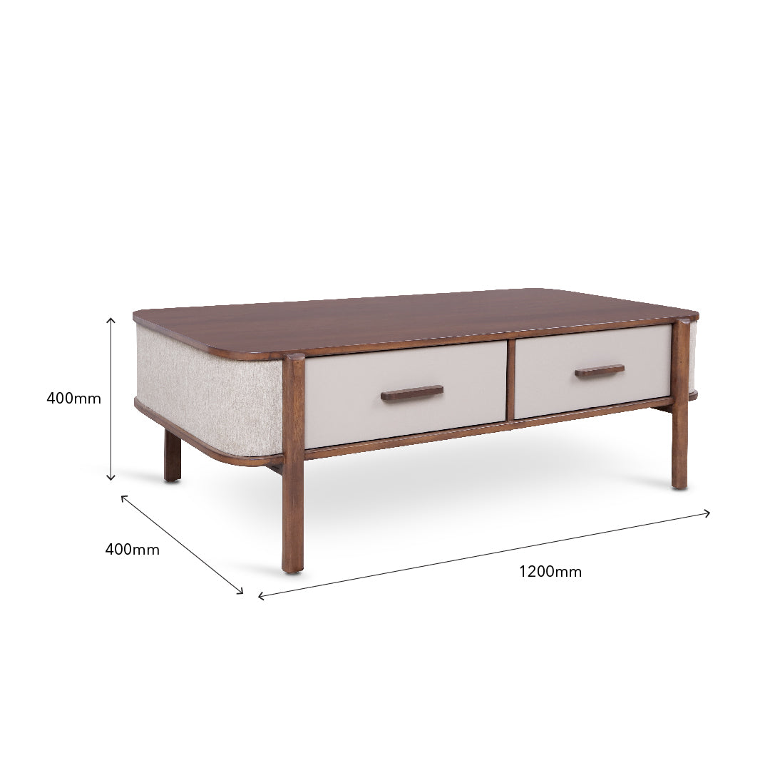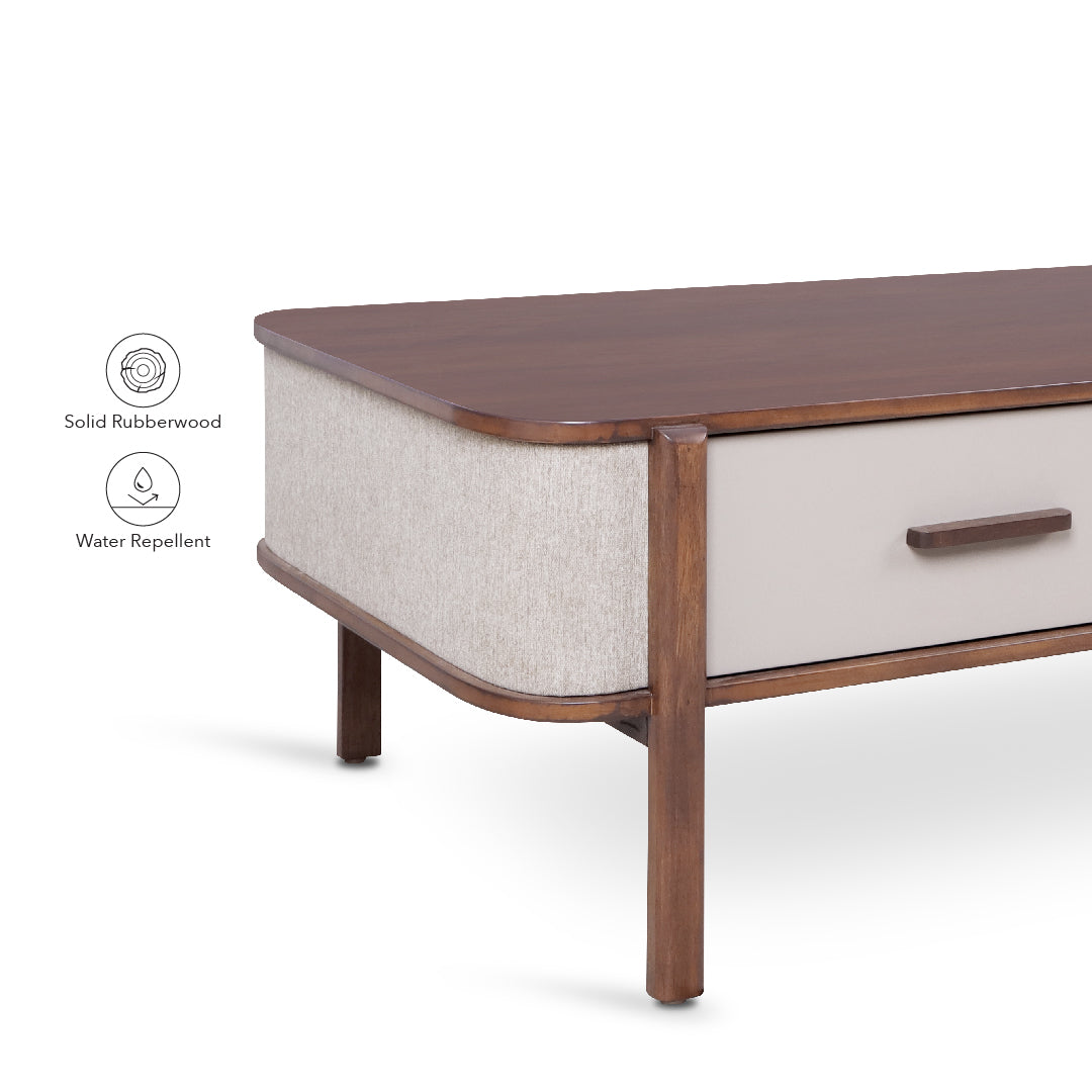 The Marra Coffee Table features a rubberwood veneer body with solid rubberwood legs and handles, blending natural warmth with modern function. It includes 2 soft-close drawers for smooth storage and water-repellent fabric sides for added style and durability.