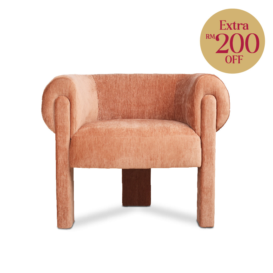 The Alder Lounge Chair is a stylish and modern addition to any living space, featuring a new design with a gracefully curved backrest that provides both comfort and visual appeal. Upholstered in a rich dark peach fabric, the seat offers a cozy and inviting feel, perfect for relaxation. The chair is supported by sturdy solid wood legs, adding a natural warmth and stability to the design. With its contemporary curves and warm tones, the Alder Lounge Chair effortlessly combines elegance and comfort, making it an ideal piece for lounges, living rooms, or cozy reading nooks.