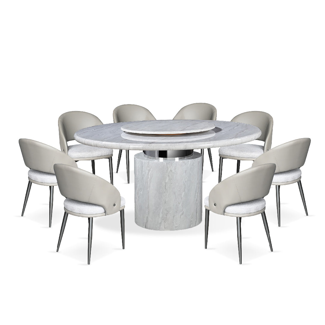 The Chagutic Marble Dining Set combines luxury and style with its elegant design. The set features a dining table with a laminated marble top, accented by a stainless steel ring along the round edge, and supported by chic marble legs. It includes eight French Grey dining chairs that add a touch of sophistication and comfort, perfectly complementing the tableās refined look. This set creates a harmonious and upscale dining experience with its blend of marble and contemporary details.