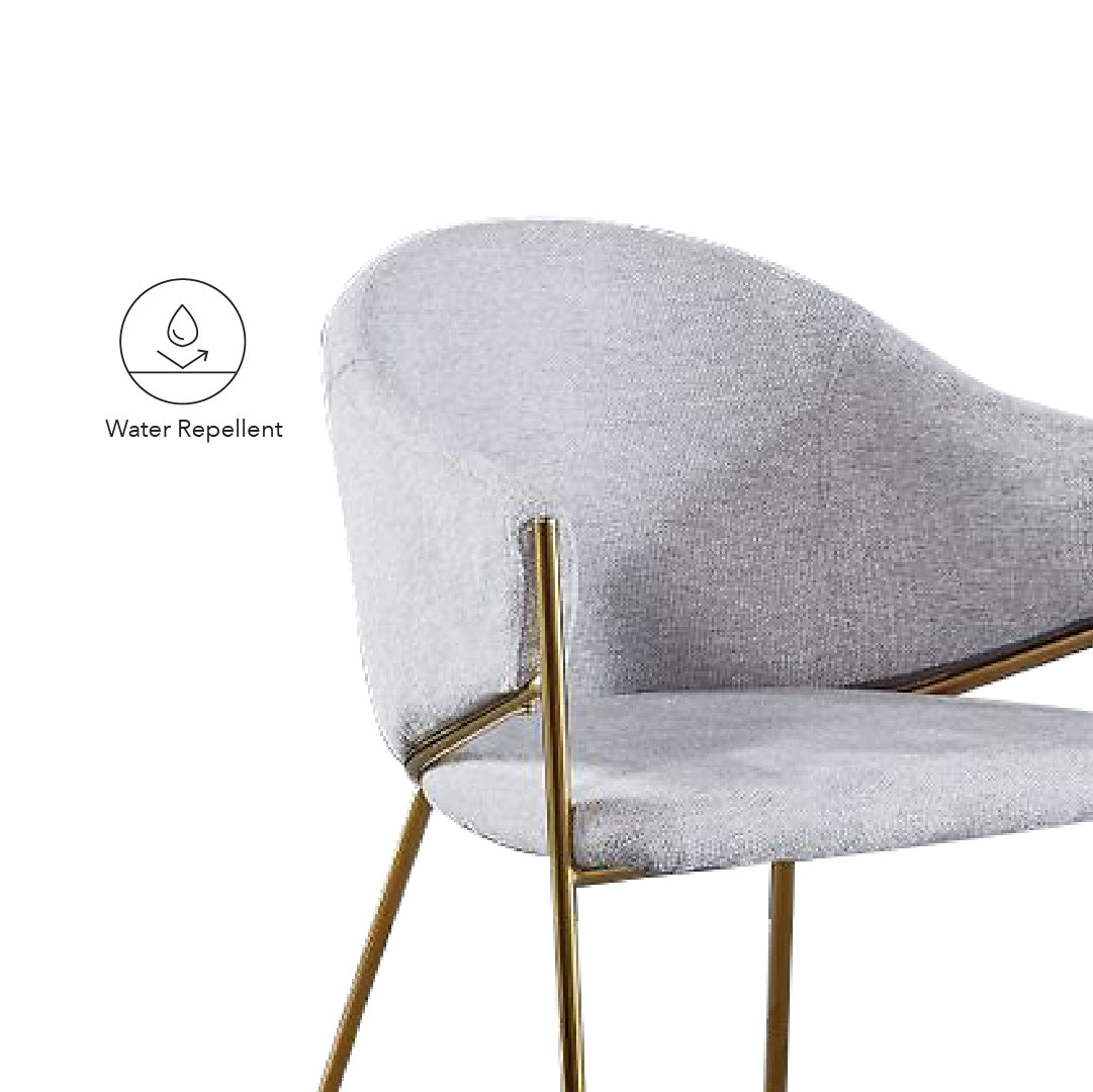 The Esme II Marble Dining Set is a stylish and luxurious addition to any dining space, featuring a sintered stone top dining table with elegant gold chrome legs, paired with six fabric-upholstered dining chairs in Pearl Beige or **Davy Grey**, also with matching gold chrome legs. The chairs are water-repellent, making the set both visually stunning and easy to maintain.
