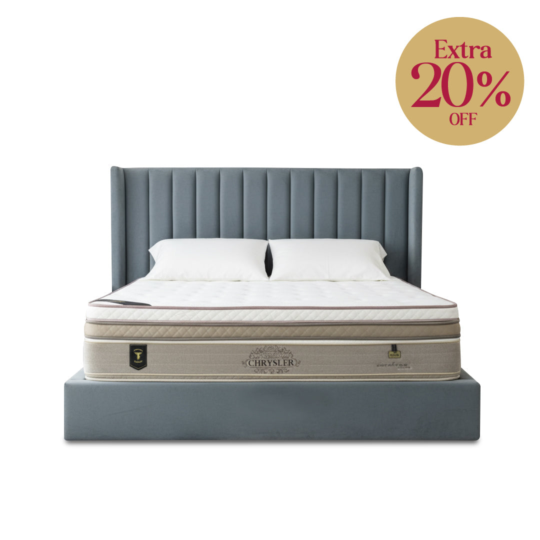 Take advantage of the LADY AMERICANA CHRYSLER Mattress to experience ultimate comfort. It envelops you with a Leggett and Platt 7 Zone hourglass spring variable rate and geometry pocket spring, together with Ice Silk, natural latex, and Valco Memory Foam. Its Ice SILK Knitted Fabric keeps you cool for a long time. Approved by chiropractors, it reduces partner disturbance and provides a masterful fusion of luxury and divine sleep with every second of relaxation.