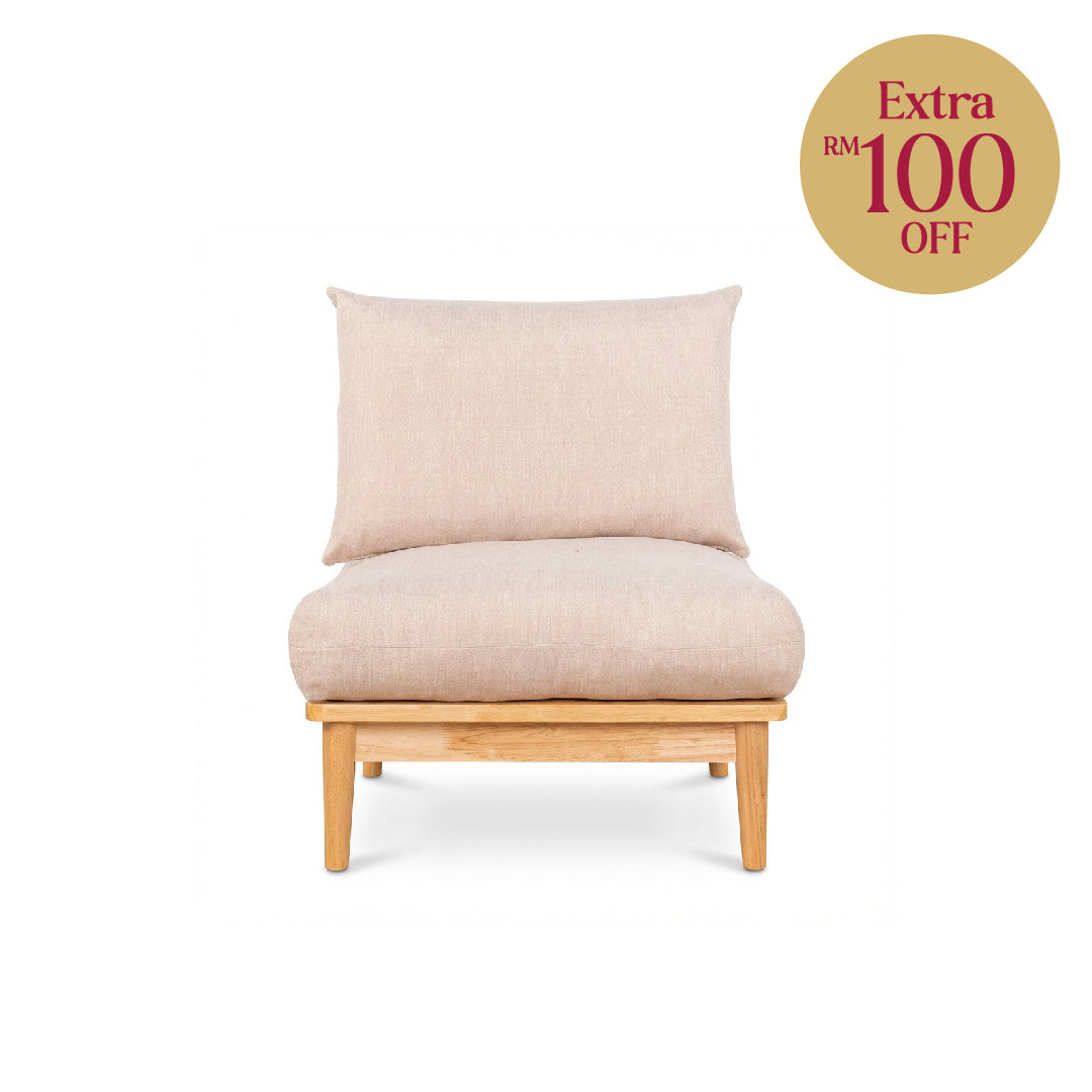 The Caroline 1 Seater Sofa combines timeless comfort with natural elegance, featuring soft beige linen fabric upholstery and a sturdy MDF frame with rubberwood veneer in a warm natural wood finish.