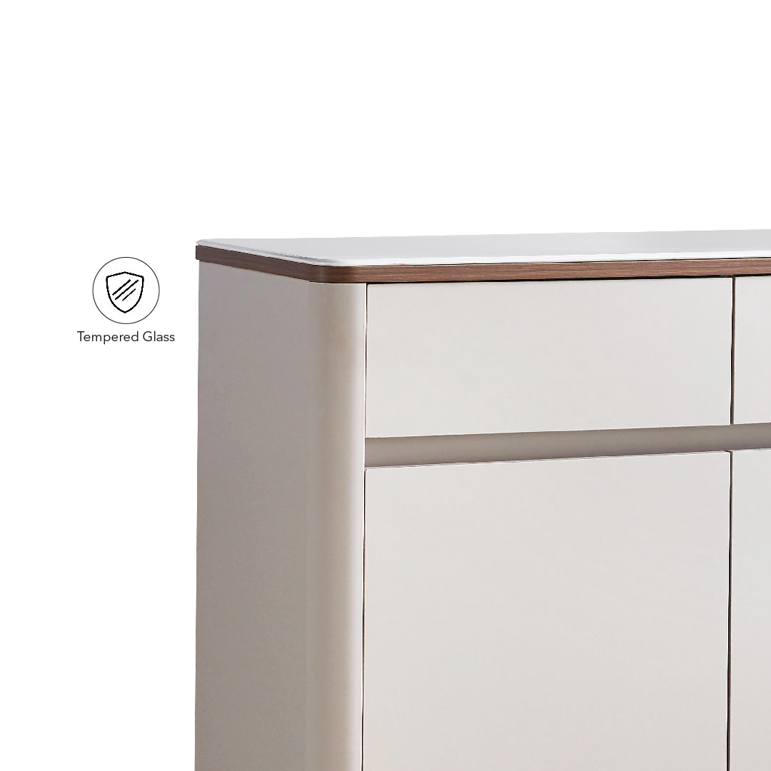 A stylish storage solution featuring a ceramic marble top, PVC vacuum body, and sturdy metal legs. Designed with 2 open doors and 2 drawers, it blends modern elegance with practical organization for your footwear and essentials.