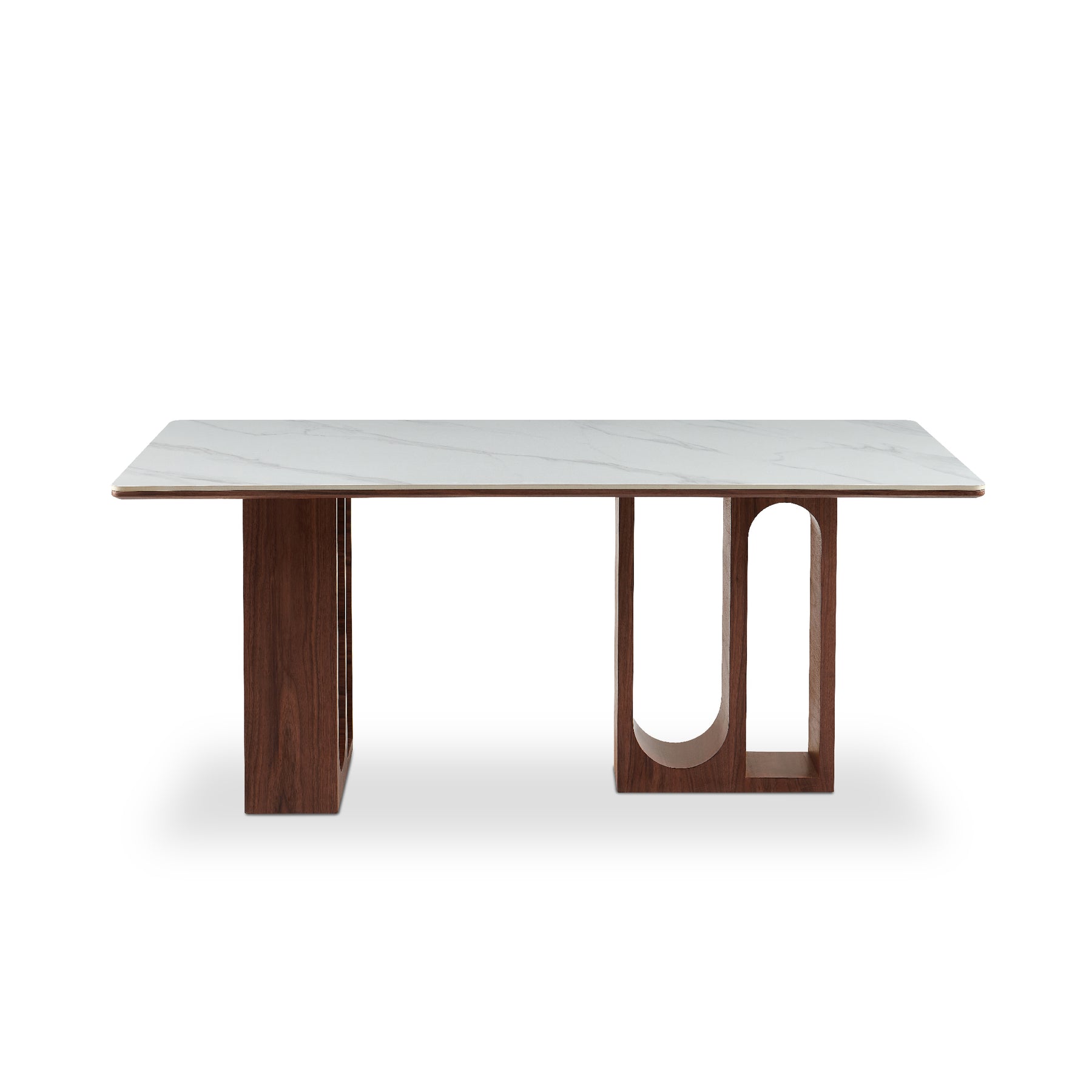 Experience modern sophistication. This rectangular dining table boasts a non-porous ceramic surface that beautifully mimics white Calacatta marble, offering superior protection against spills and high temperatures. The rich, deep walnut wood legs are crafted into unique, geometric arches, providing a strong, artistic foundation and a striking minimalist aesthetic.