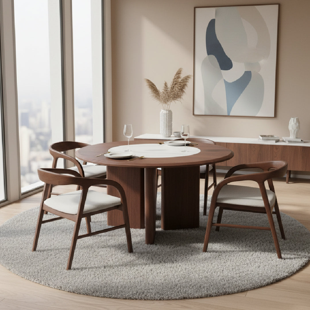 The Usami table is a masterpiece of modern design. It features a stunning, durable ceramic inlay that offers the beauty of marble with superior scratch and heat resistance. The sleek, circular tabletop and bold, architectural wood veneer base create a sophisticated, warm centerpiece perfect for contemporary dining.