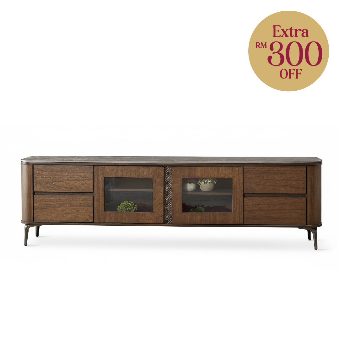 The Marley Ceramic TV Cabinet combines modern elegance with functional design. It features a ceramic top, Mindi veneer body, and solid metal legs in a titanium metallic finish. With four drawers and two soft-close doors with tempered glass, it offers ample storage while adding a sleek, contemporary touch to any living room.