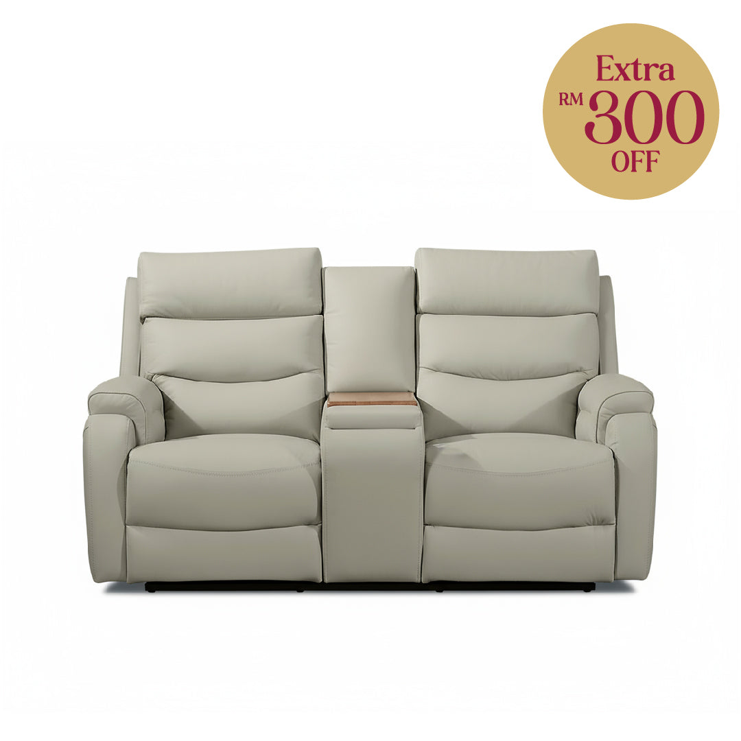 Rydia Manual Recliner 2-Seater Sofa combines comfort and functionality with its half-leather upholstery, high-density foam seat, double pocket spring, and zigzag spring support on a solid Meranti wood frame. Designed for relaxation, it features manual recliners on both seats, adjustable headrests, a convenient storage table, and integrated cup holders for added comfort and practicality.