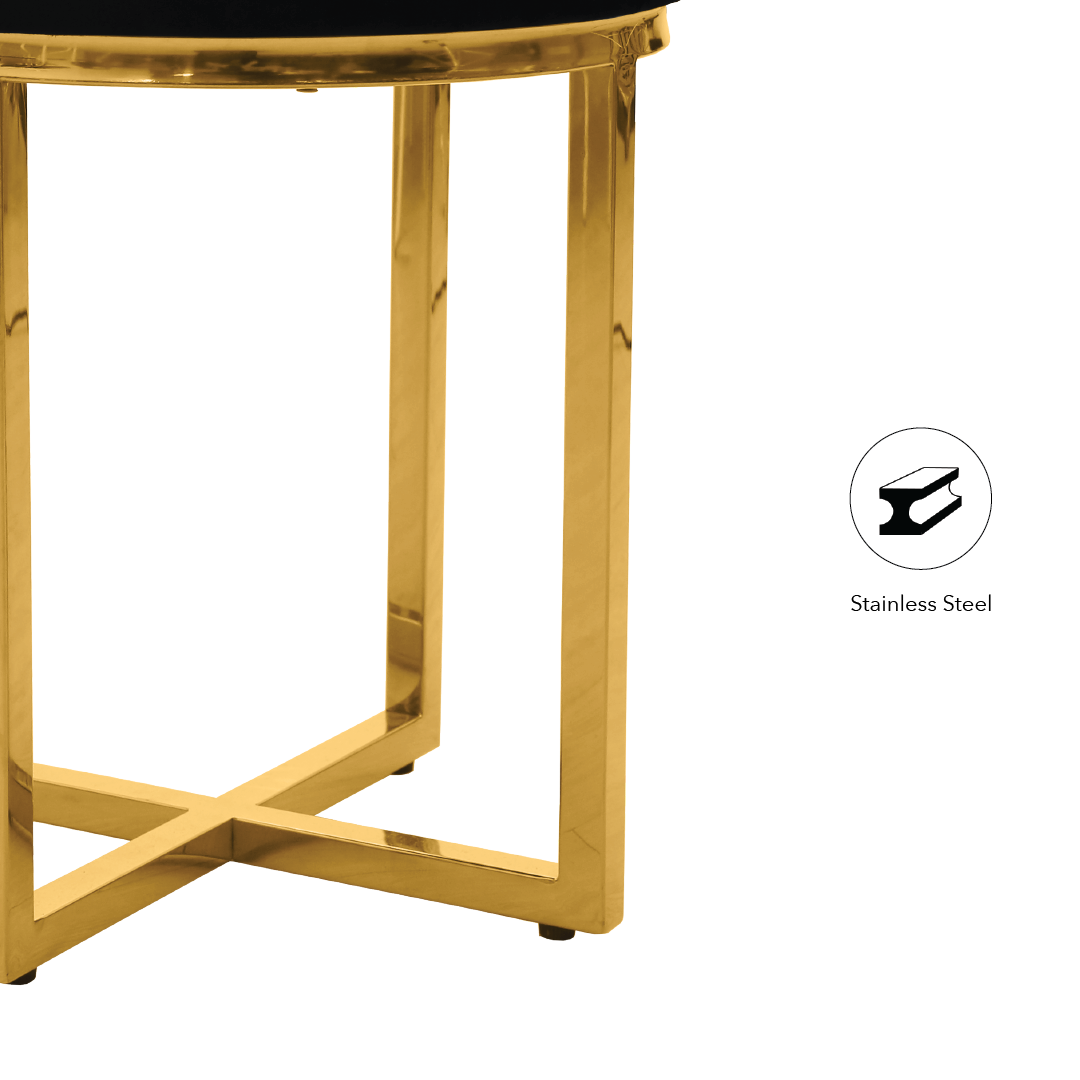 Presenting the AURYN Ottoman Black, the pinnacle of comfort and style. Its high-density foam seat, crafted from opulent black velvet, promises opulent relaxation. Its gold stainless steel legs, which enhance both appearance and durability, are equally lavish. Refinement meets resplendence in the AURYN Ottoman Black, an elegant piece that will never go out of style.